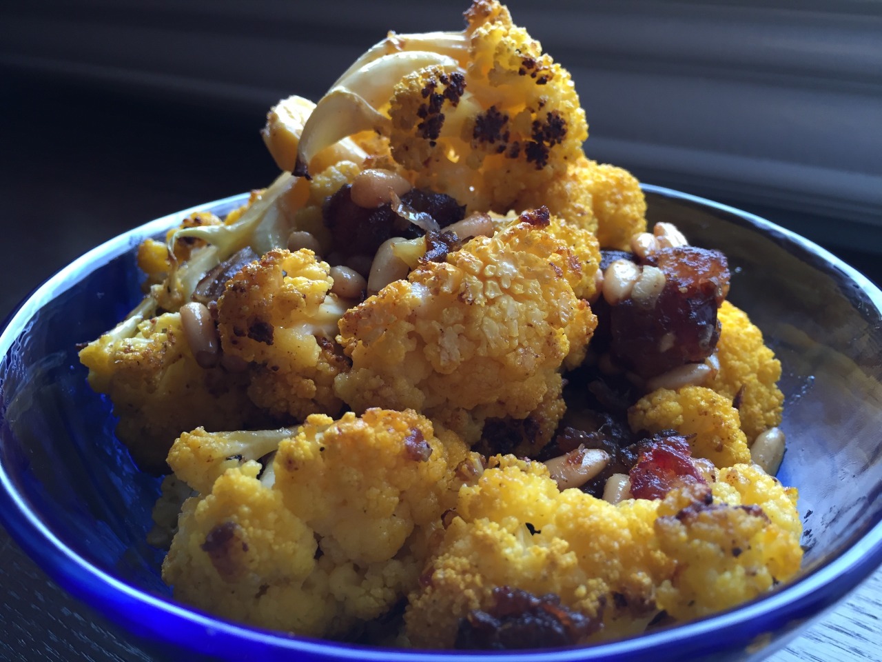 I stumbled upon this recipe, and it was delicious – sweet, savory, and a little salty. Details here: http://www.foodnetwork.com/recipes/claire-robinson/roasted-cauliflower-with-dates-and-pine-nuts-recipe.html (Mar. 2016)