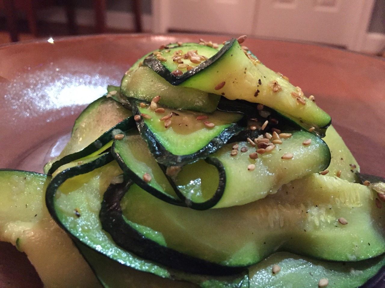 Using a mandolin, thinly slice one large zucchini on a diagonal, then set aside. Separately, heat 2 tsp neutral vegetable oil in a large wok, then add 1 clove garlic (microplaned) and 1 tsp anchovy paste. Sauté until fragrant, then add 1 Tbsp mirin and the zucchini ribbons. Mix well, and sauté until zucchini is cooked. Sprinkle with toasted sesame seeds, then serve. This recipe is from Chef Judy Joo and available here: http://judyjoo.com/recipe-landing/seafoods/steamed-ginger-infused-sea-bass-with-zucchini/ (Apr. 2016)