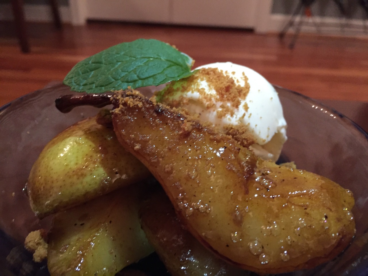 We tried this Chuck Hughes recipe that involves butter, brown sugar, pears, and a splash of bourbon. We garnished with Ben & Jerry’s vanilla ice cream and crumbled Biscoff (in lieu of graham crackers). Recipe here: http://m.cookingchanneltv.com/recipes/chuck-hughes/caramelized-pears.html (Apr. 2016)