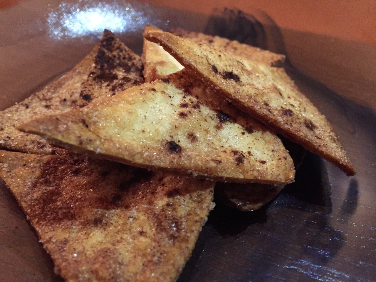 We had leftover flour tortillas, so we tried out this recipe, which is a healthier version of buenelos: http://www.spiciefoodie.com/2012/05/04/healthy-cinnamon-sugar-chips/. However, instead of tossing the oiled, baked chips in cinnamon sugar, we tossed pieces a little vegetable oil, then added the cinnamon-sugar mixture to coat the pieces before baking. We also sprinkled extra cinnamon sugar on each piece before putting them in the oven at 400 for about 8 mins. We used a sugar:cinnamon ratio of 3:1. (Apr. 2016)