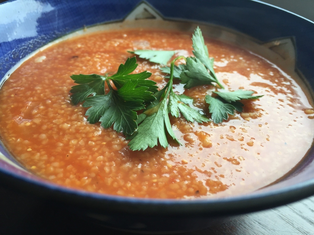This is a great recipe if you’re feeling under the weather. Using a medium Dutch oven, bring 6 cups low-sodium chicken broth to a boil. Separately, using a small pan, heat 1 Tbsp olive oil (the recipe calls for 2 Tbsp) on medium heat then sauté 1 small chopped onion. When onion is halfway cooked, add 3 cloves minced garlic (my modification) and continue to sauté until lightly browned and fragrant (a total of 10 mins), then set aside. When chicken broth comes to a boil, stir in 6 oz tomato paste, making sure tomato paste fully dissolves. Then add 1 cup fine-grain bulgur (bulgur #1), 1 tsp salt, and ¾ tsp black pepper. Fold in the onion-garlic mixture, then cover and reduce to a simmer for 10 mins. Add the juice of one lemon to the pot. Season to taste (we added 1 tsp sugar), then serve. We garnished with parsley. This recipe is from Barbara Ghazarian’s Simply Armenian: Naturally Healthy Ethnic Cooking Made Easy https://www.amazon.com/dp/1931834067/ref=cm_sw_r_sms_api_yk4kxbK0ZXXME (May 2016)