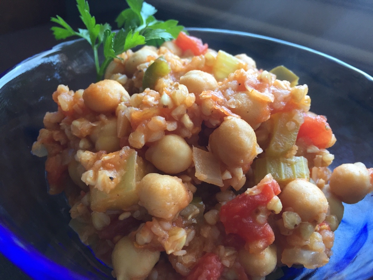 Heat 2 Tbsp olive oil in a large Dutch oven on medium heat. Add 1 ¼ cups coarse-grain bulgur wheat (here, buckwheat kernels) and sauté until toasted. Add 1 medium onion (chopped) and sauté until fragrant, then add 3 cloves minced garlic. Sauté for a minute, then add 3 stalks celery (diced) and cook for a few more mins. Fold in 29 oz canned peeled and chopped tomatoes (here, we added 4 peeled and chopped fresh tomatoes and one 14 ½ oz canned tomatoes), 28 oz drained and rinsed canned chickpeas, 1 ½ chopped and seeded fresh jalapeño peppers, 1 tsp each sugar and salt, ½ tsp each cumin and ground black pepper, and ¼ tsp cayenne pepper. Pour in 1 ½ cups water and stir. Cover and reduce to a simmer until most of the liquid has been absorbed and bulgur/buckwheat is tender (about 20-25 mins). Season to taste; we added a little more salt and a dash of white balsamic vinegar (infused with cranberry and pear). Recipe from Barbara Ghazarian’s Simply Armenian: Naturally Healthy Ethnic Cooking Made Easy https://www.amazon.com/dp/1931834067/ref=cm_sw_r_sms_api_Sn3lxbEYB8Y46. Our modifications: buckwheat instead of bulgur and the addition of jalapeños and white balsamic vinegar. (May 2016)