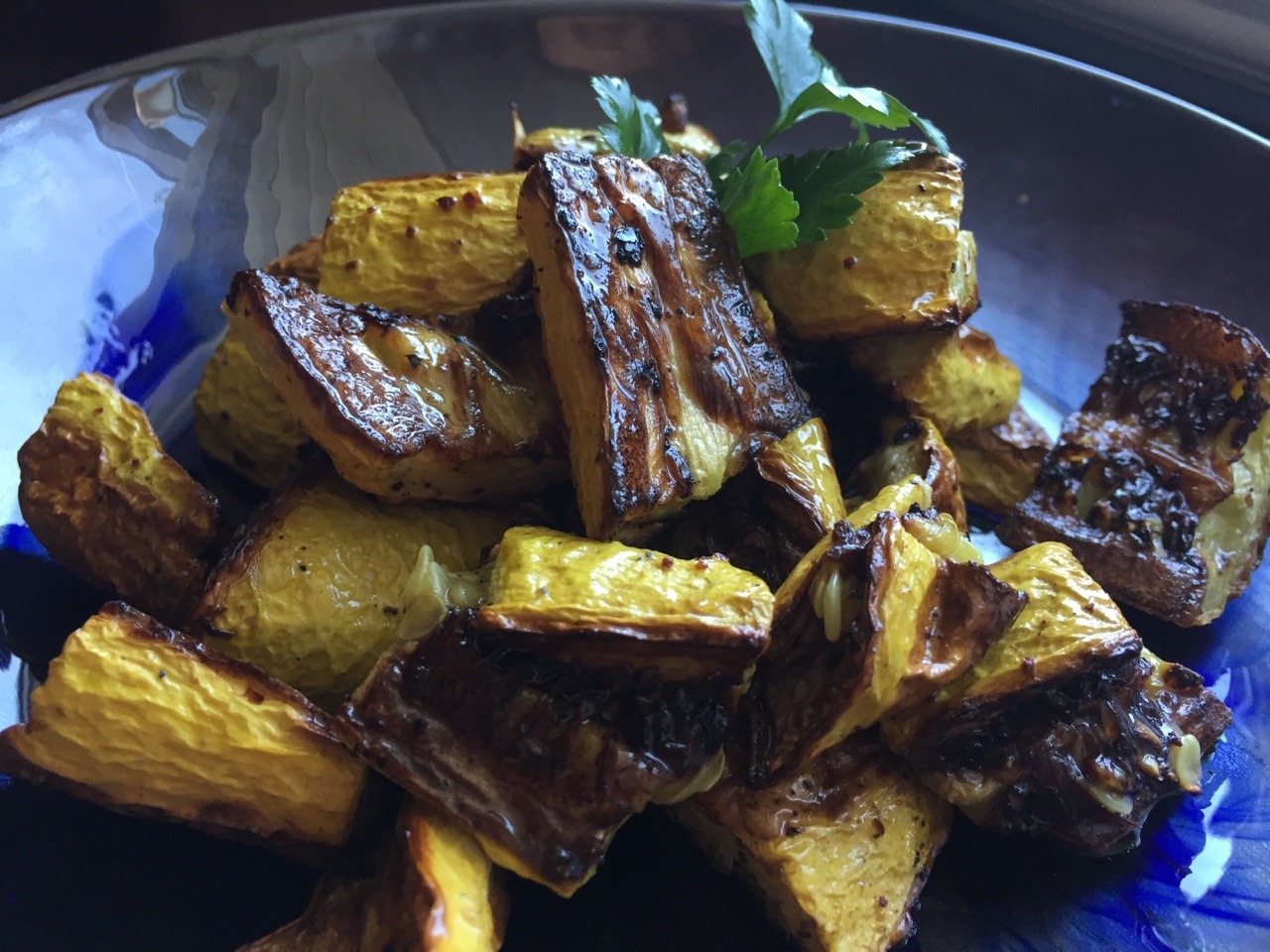 Preheat oven to 400. Trim top and ends of three medium yellow summer squash, halve vertically, then cut into 1 inch chunks. Toss with about 1 Tbsp olive oil, then season with a little salt, black pepper, and marash pepper. Spread in a single layer on a baking sheet, then roast in oven for 45-50 mins (tossing about halfway). Recipe based on: http://www.craftycookingmama.com/summer-yellow-squash-roasted-in-lemon-olive-oil/, but we skipped the lemon. (May 2016)