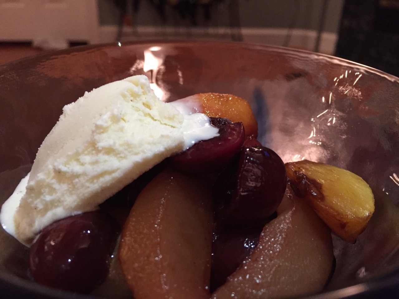 We followed this recipe but used two pears as well as peaches and cherries: http://cookieandkate.com/2013/balsamic-stone-fruit-sundae/. We modified by increasing balsamic vinegar to 4 Tbsp (¼ cup). (May 2015)