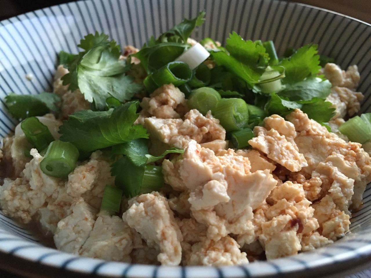 Finally, assemble the dish: Add 3 Tbsp Chinese soy sauce salad dressing to the crumbled tofu, and lightly toss. Add salt if needed, and sprinkle on some chopped cilantro and scallions (maybe 2 Tbsp total). Serve at room temperature or cold. (May 2016)