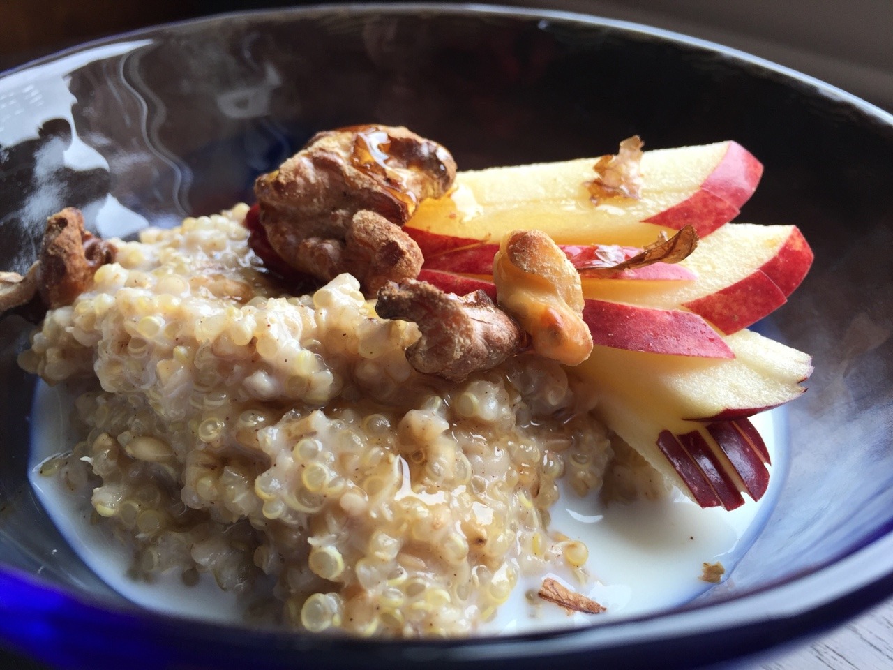 Recipe here: http://www.bonappetit.com/recipe/quinoatmeal-apple-toasted-walnuts. We forgot to soak the grains overnight, so we let them sit in boiling water for 30 mins before starting step 2. We also used 1% milk instead of soy, and we garnished with about ½ tsp honey per serving. This makes two servings for breakfast. (June 2016)