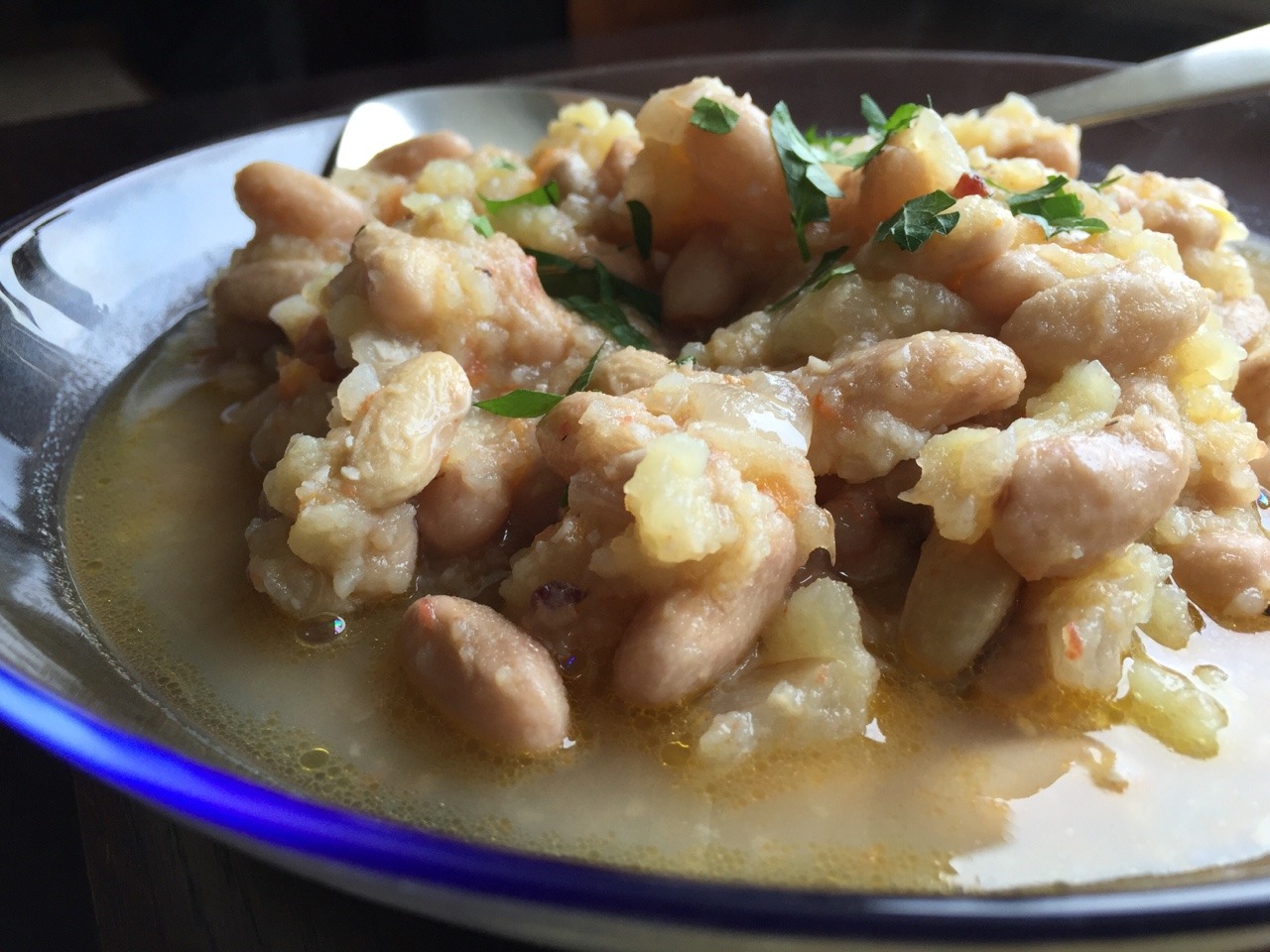 This is an elegantly simple recipe from Jamie Oliver: http://www.foodnetwork.com/recipes/jamie-oliver/humble-home-cooked-beans-recipe.html. We modified by starting with the following flavor base: sauté 1 oz center cut bacon (cut into matchsticks) until browned, then add 2 minced shallots and sauté until fragrant. We also used: 8 cloves minced (peeled) garlic in lieu of 3 unpeeled cloves; 2 small peeled Yukons instead of 1; and ½ tomato instead of 2 grape tomatoes. We served this with lightly buttered, toasted pumpernickel, each slice cut in half. For convenience, we placed all of the herbs in a bouquet garni rather trying to fish out individual herbs later. This recipe can be vegetarian if you omit the bacon. (June 2016)