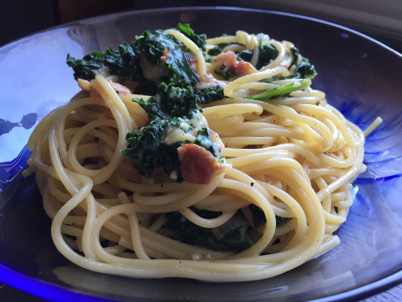 We tried this one-skillet recipe: http://www.seriouseats.com/recipes/2013/09/spaghettie-carbonara-with-kale-recipe.html. Our modifications: reduced bacon to 4 oz (from 8 oz), increased chicken broth to 4 cups (from 3 ½ cups, gradually over time), reduced Parmesan to ¾ cup, and omitted any additional salt. (June 2016)