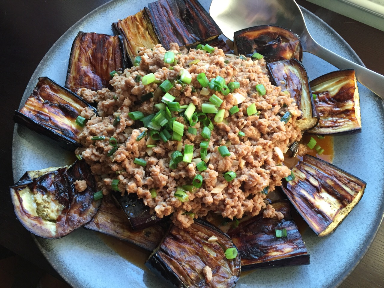 We followed this twist on ma po tofu by Andrew Zimmern: http://andrewzimmern.com/2015/02/24/ma-po-eggplant-garlic-sauce/. Instead of broiling the eggplant, we oven-roasted it at 450 for 30 mins. We followed this recipe but used peanut oil and a little salt and black pepper. http://piglettedc.tumblr.com/post/143686120171/oven-roasted-eggplant-preheat-oven-to-450-cut (July 2016)