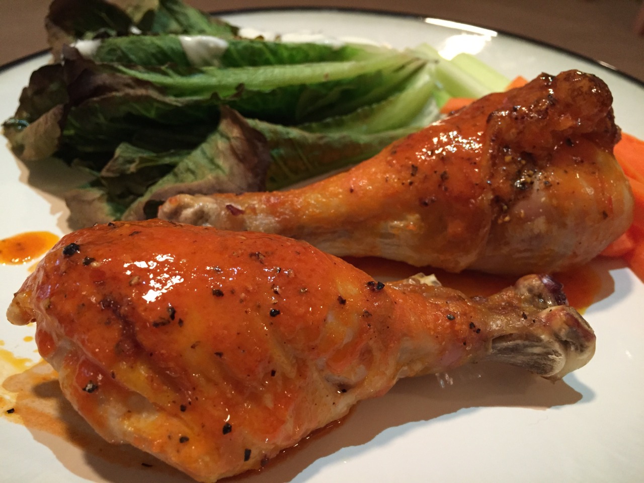 Our modifications: We increased basic cooking time from 30/35 mins to 40 mins. We also made extra buffalo sauce, increasing the ratio by 50% to ¾ cup hot sauce and 6 Tbsp melted butter. We garnished with carrot and celery sticks.