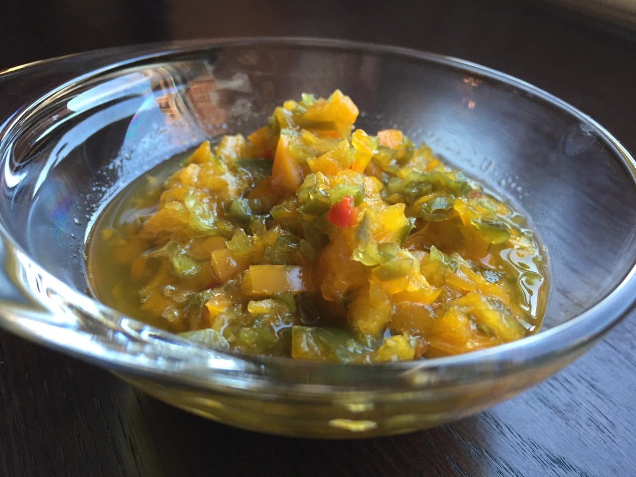 We followed this recipe: http://www.theorganicprepper.ca/this-weeks-harvest-jalapenos-07232013 but reduced proportions as follows: 5 medium jalapeños and ½ orange bell pepper, seeded and then roughly chopped in a food processor, ¼ cup sugar, and ½ cup white vinegar. We skipped the cilantro. (Aug. 2016)