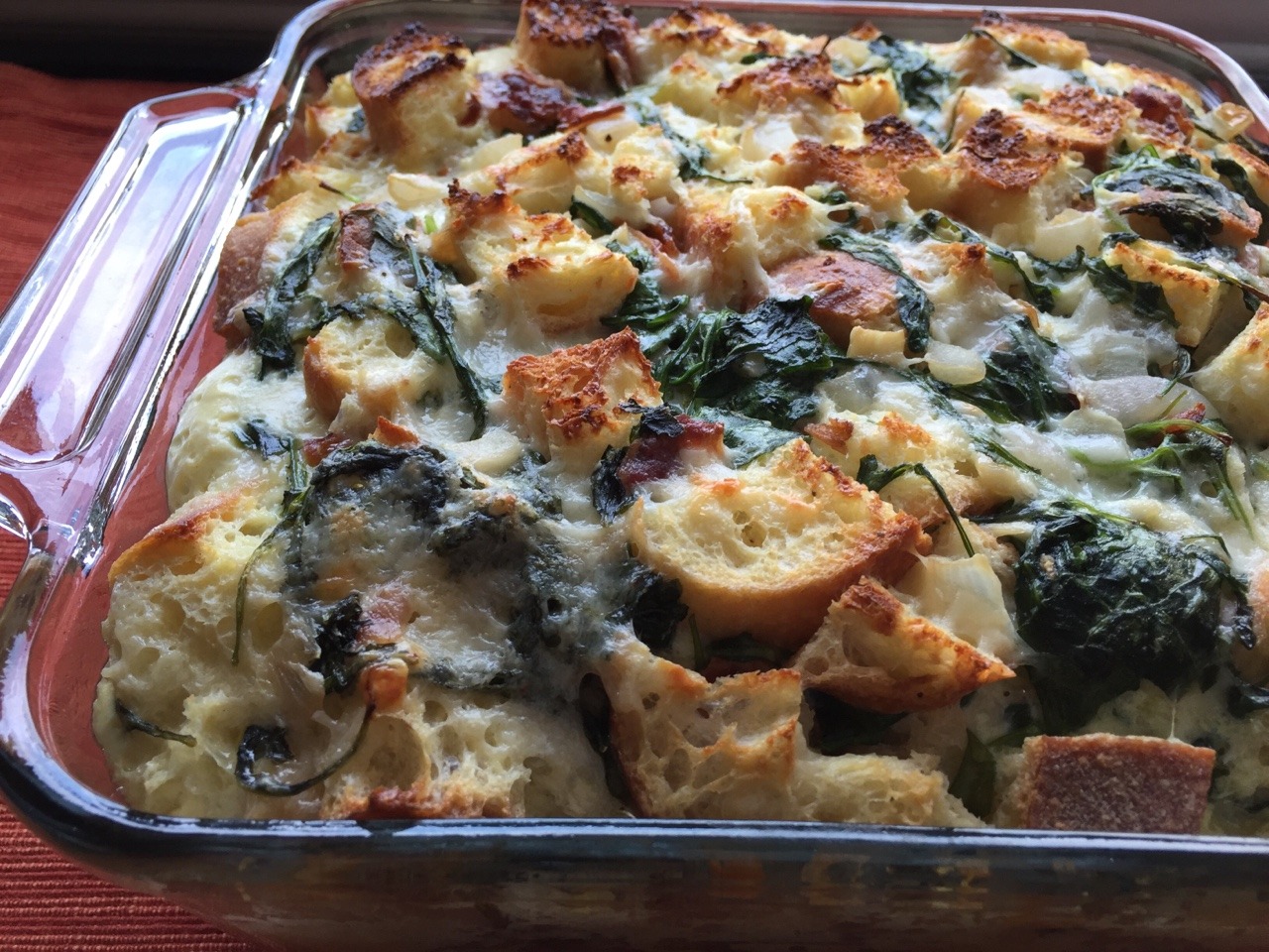 We tried this recipe for 2/3 of a leftover ciabatta loaf: http://www.epicurious.com/recipes/food/views/arugula-bacon-and-gruyere-bread-pudding-350898 We baked for an additional 10 mins and broiled it on high for 2 mins for browning. (Sept. 2016)