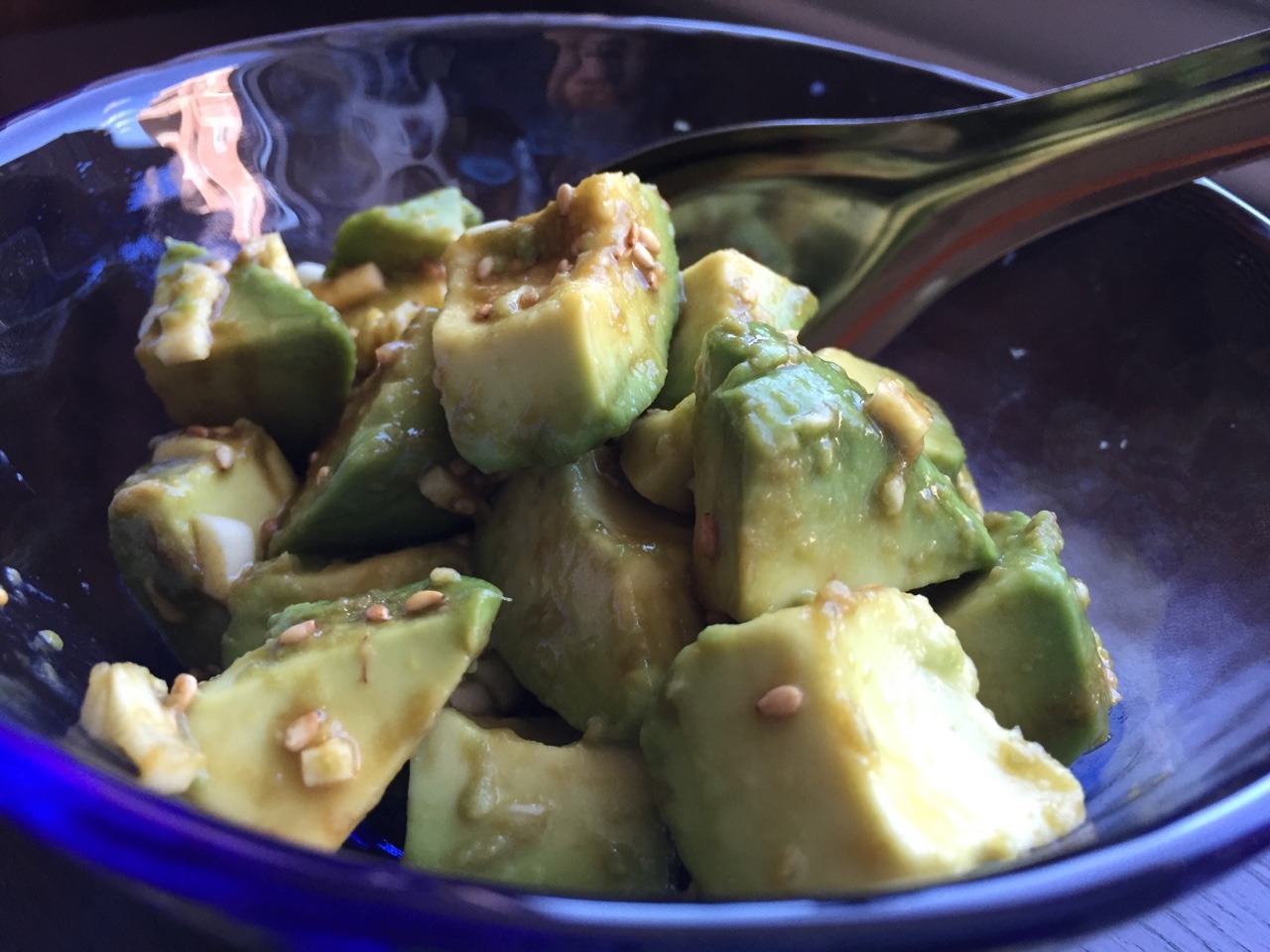 Cut one ripe avocado into bite-sized chunks, then gently toss with about 1 tsp soy sauce, 1 clove minced garlic, and about ½ tsp microplaned ginger. Drizzle with about ½ tsp toasted sesame oil and sprinkle with a tsp of toasted sesame seeds. We served this with cooked rice and roasted seaweed. This recipe is loosely based on: http://allrecipes.com/recipe/102049/asian-avocado/ (Sept. 2016)