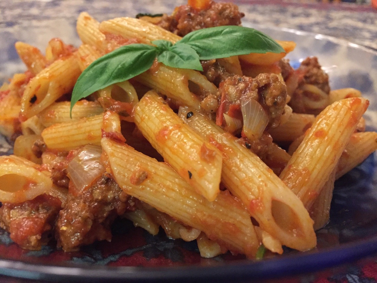 We tried this recipe: http://www.simplyrecipes.com/recipes/penne_pasta_with_meat_sauce/ Our modifications: first, we used 28 oz crushed tomato in lieu of chunky tomato sauce, which we added immediately to the cooked garlic-onion mixture and let simmer for while we browned the ground beef separately and cooked the pasta. We also doubled the amount of garlic. Second, we used fresh marjoram, oregano, rosemary, and thyme in lieu of Italian seasoning and other dried herbs. Finally, we seasoned to taste with a splash of red wine, balsamic vinegar, and fruit-infused balsamic vinegar. (Oct. 2016)