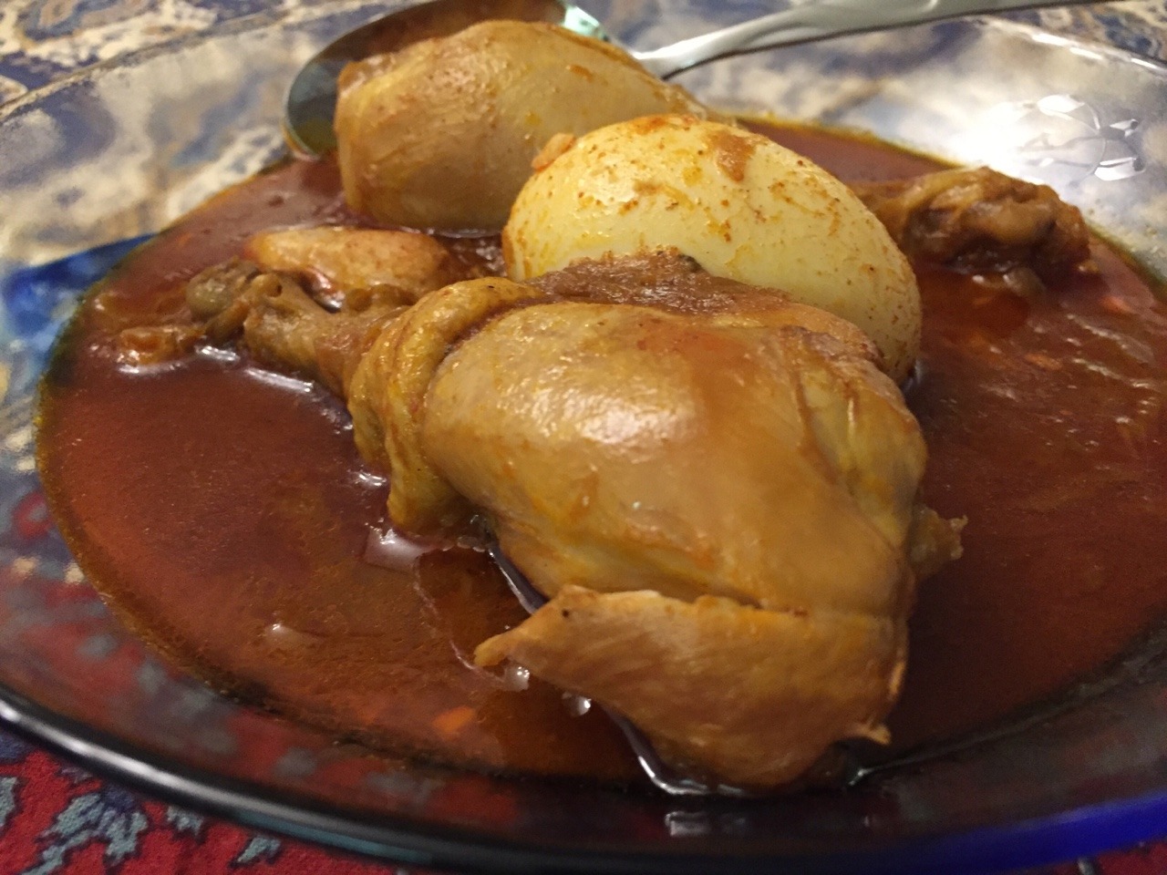 http://www.daringgourmet.com/2013/08/27/doro-wat-spicy-ethiopian-chicken-stew/ but made a few modifications. First, instead of 7 Tbsp unsalted butter, we used a mix of butter, olive oil, and grapeseed oil (6 Tbsp total, reduced from 7). Second, we used one large red onion and sliced in along the grain. Third, we used 10 skin-on, bone-in drumsticks in lieu of chicken thighs or breasts. Fourth, we shortened the cooking time for step 2 to 30 mins and step 3 to 20 mins. Finally, we increased the number of hard-boiled eggs from 4 to 5, following this recipe: http://www.thekitchn.com/how-to-boil-eggs-perfectly-every-time-cooking-lessons-from-the-kitchn-202415 After peeling the hard-boiled eggs, we used a salad fork to prick each egg several times so that it would absorb the sauce, then gently placed the eggs into the stew. We served this with potato and carrot alicha and jasmine rice. (Oct. 2016)