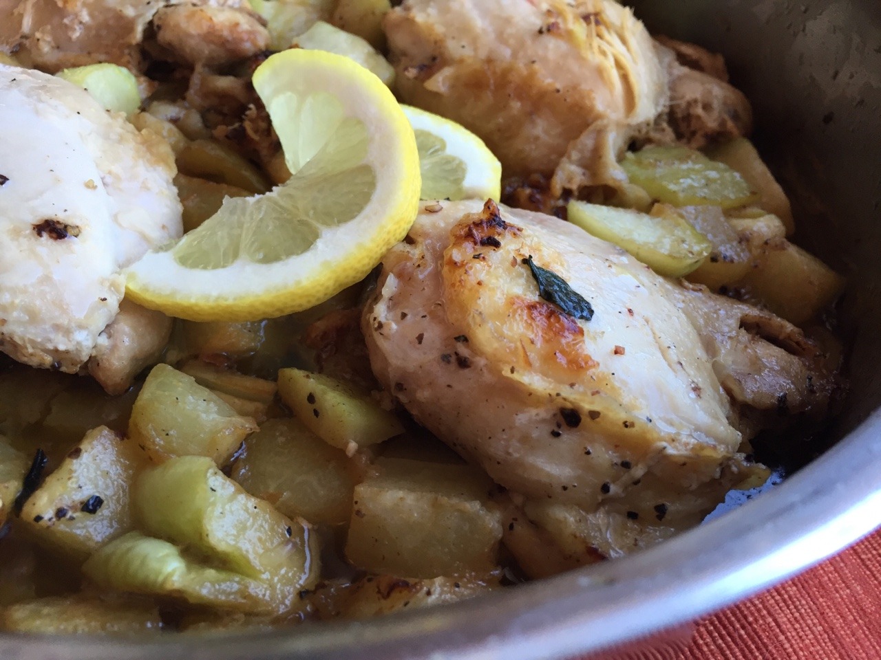 We had extra chayote and decided to try this one-pan meal: http://www.chowhound.com/recipes/braised-chicken-and-chayote-27664 First, heat a large sauté pan for 15 seconds, then pour in a little oil and spread it so that a sheen of oil covers the floor of the pan. Once the oil starts shimmering, place the chicken, skin-side down, in the pan. Immediately move the chicken around once to make sure the skin does not stick to the pan, and then leave the chicken alone so that the skin can crisp up. After 20 mins, you can turn over the chicken pieces. Otherwise, you lose the crispy skin aspect of this dish, as we did this time. We found that the last step of cooking took about 25 mins, and we increased the amount of lemon juice from a half-lemon to a whole. (Oct. 2016)