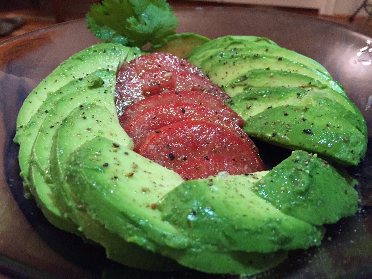 We cut one avocado and half a tomato into ¼ inch slices, then drizzled with the juice of one lime, seasoned rice wine vinegar (Marukan yellow label), and olive oil. We sprinkled lightly with salt and freshly ground black pepper, and garnished with cilantro. We loosely based this dish on delicious Peruvian sliced avocado salad that we had in NY a few months ago. (Oct. 2016)