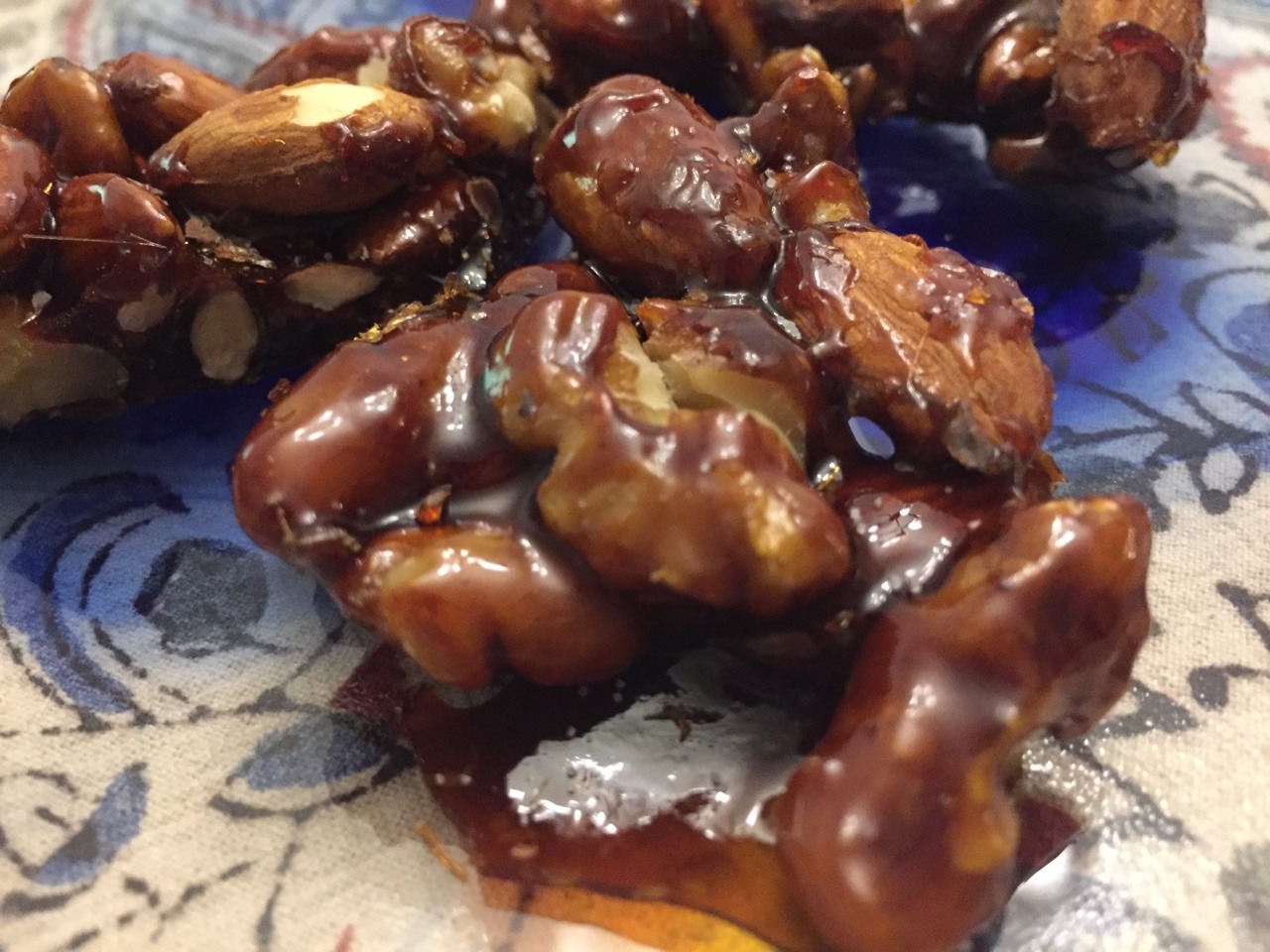 We tried this Ina Garten recipe: https://barefootcontessa.com/recipes/salted-caramel-nuts For some kick, we added ¼ tsp cayenne pepper along with the kosher salt. Based on our pantry, we used 2 cups each walnuts and almonds. We also overheated the caramelized sugar, so this has a slightly bittersweet flavor. The next time, we will try these instructions from the Kitchn: http://www.thekitchn.com/technique-caram-6291 (Dec. 2016)