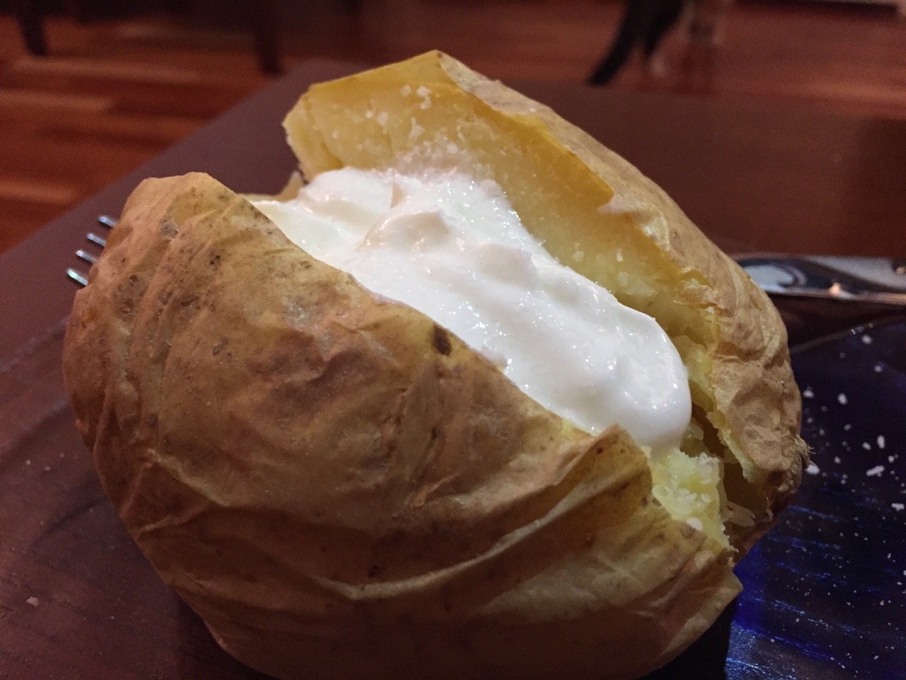 We tried this microwave recipe for baking a potato, and it was surprisingly good: http://www.familyfoodonthetable.com/10-minute-baked-potatoes/ We baked 2 medium Yukon potatoes in 11 mins total. Specifically, we poked the top of each potato several times with a fork, placed about 3 inches apart on a large, microwave-proof plate, and microwaved for 10 mins on high power (100 on our microwave setting). We squeezed the potatoes with a paper towel, found them almost done, and then turned each potato upside down before microwaving for 1 additional minute. To serve, we cut a long slit along the clean (non-pierced) side of the potato and gently squeezed the sides to make the insides fluffy. We served this with nonfat plain Greek yogurt and kosher salt. (Dec. 2016)