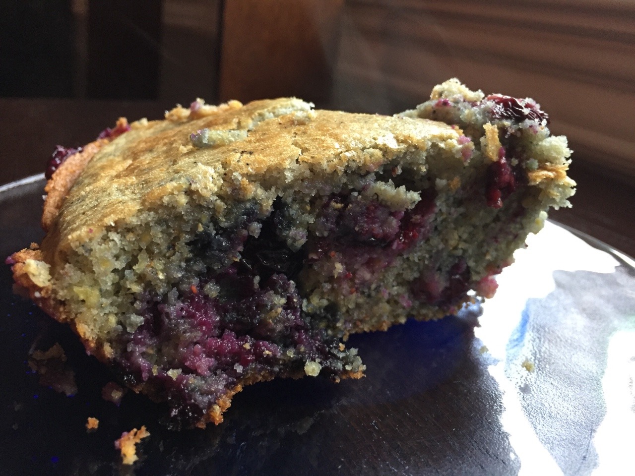 Note: The blueberries all sank beneath the surface. What we might try next time is to wait to add the 15 reserved berries to the top of skillet after 15 mins of baking. (Dec. 2017)