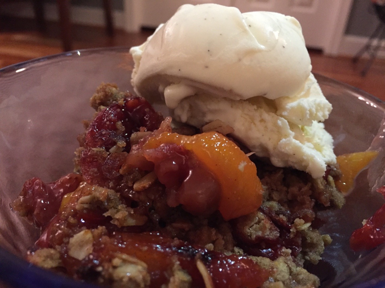 We tried this recipe from Food & Wine: http://www.foodandwine.com/recipes/old-fashioned-strawberry-rhubarb-crisp Our modifications: first, the recipe calls for 2 lb rhubarb, but we could find neither fresh nor frozen, so we used 1 lb frozen peach slices instead. Because peaches are not as tart as rhubarb, we reduced the amount of white sugar by ½ cup (for a total of ¾ cups white sugar for the entire recipe) and reduced the brown sugar from 1 ½ cups to 1 ¼ cups. Second, we used old-fashioned oats in lieu of quick-cook rolled oats. Finally, we used a slotted spoon when transferring the fruit filling from the mixing bowl to the baking dish to prevent too much liquid in the filling. (Jan. 2017)