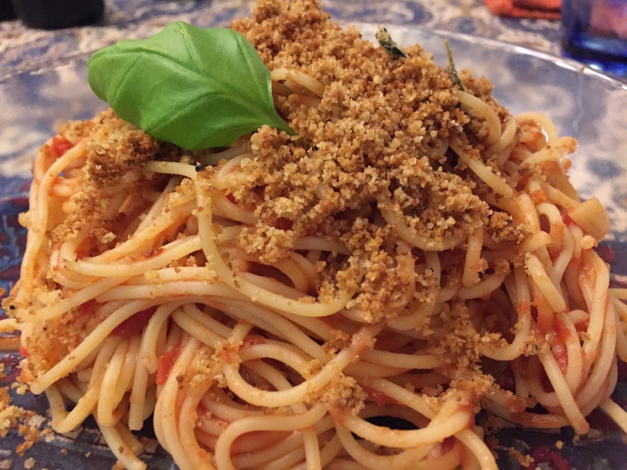 We followed this recipe: https://www.budgetbytes.com/2016/07/pasta-5-ingredient-butter-tomato-sauce/ Our modifications: we used 28 oz canned crushed tomato and a few sprigs fresh oregano in lieu of whole peeled tomatoes and dried oregano. We also added a dash each crushed red pepper and sugar to the sauce. The toasted breadcrumbs add nuttiness and mouthfeel to this dish. (Jan. 2017)