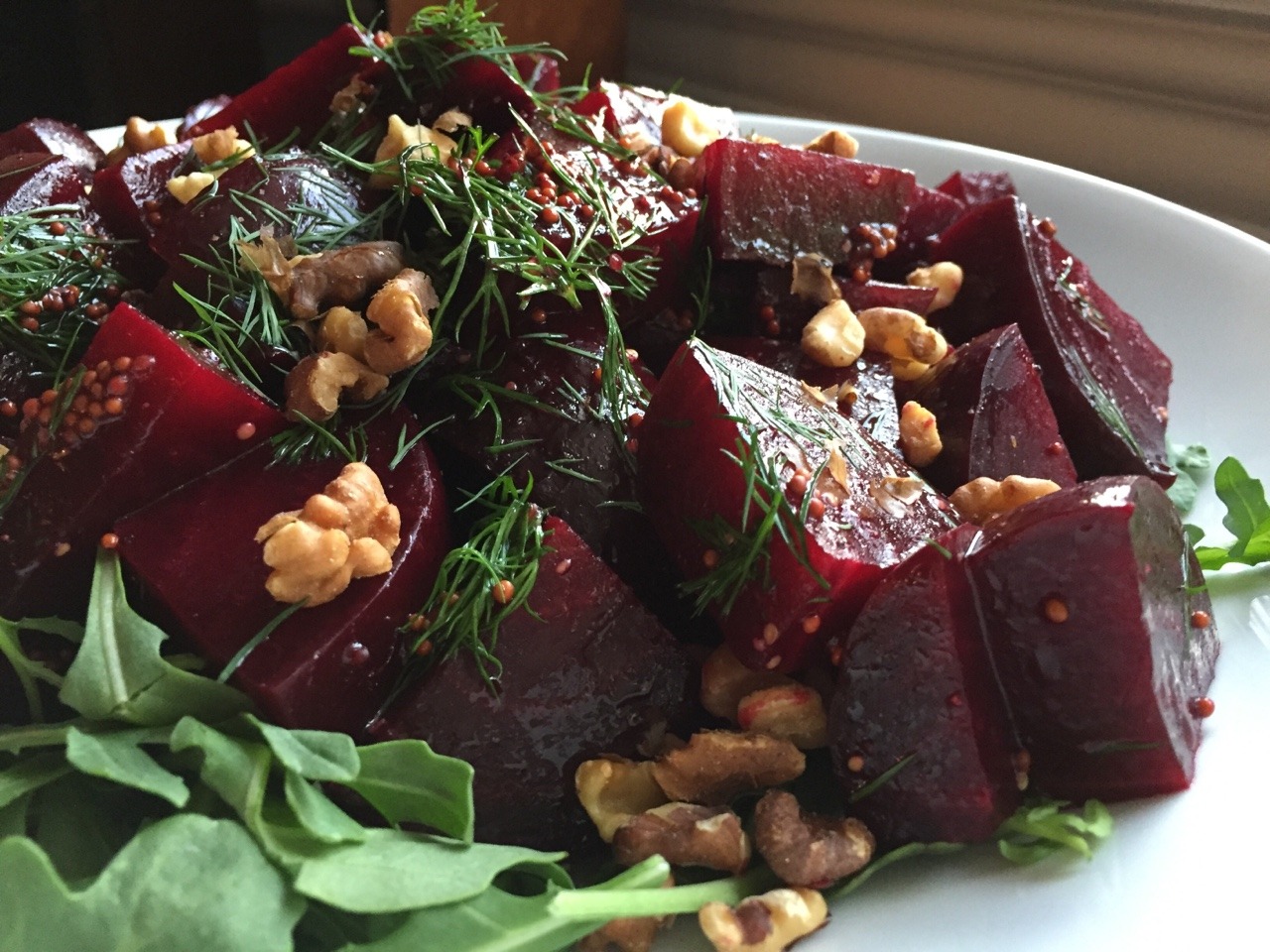 We loosely followed this recipe: https://www.myrecipes.com/recipe/beets-with-dill-walnuts. Our modifications: first, instead of pressure-cooking 6 medium-large beets, we oven-roasted them for 40-45 mins (instructions here: https://piglettedc.wordpress.com/2015/03/25/roasted-beets-this-is-one-of-my-favorite/). After letting them cool (inside their foil packets), we rubbed off their skin with paper towels. We cut each beet into large chunks by slicing in half vertically, then cutting each beet half into 6 wedges (½” x 1″). Second, for the vinaigrette, we whisked together 1 Tbsp apple cider vinegar, the juice of one medium lemon (about ¼ cup, or 4 Tbsp), 2 tsp sugar, 2 tsp Maille wholegrain mustard (instead of Dijon ), ¾ tsp salt, and ¼ tsp black pepper. We next whisked in 3 Tbsp olive oil and 2-3 Tbsp chopped fresh dill before tossing the vinaigrette with the beets. We served the beets over baby arugula and garnished with ¼ cup toasted walnuts. We served this salad with Russian black bread as an appetizer before Polish stuffed cabbage leaves. (Apr. 2017)