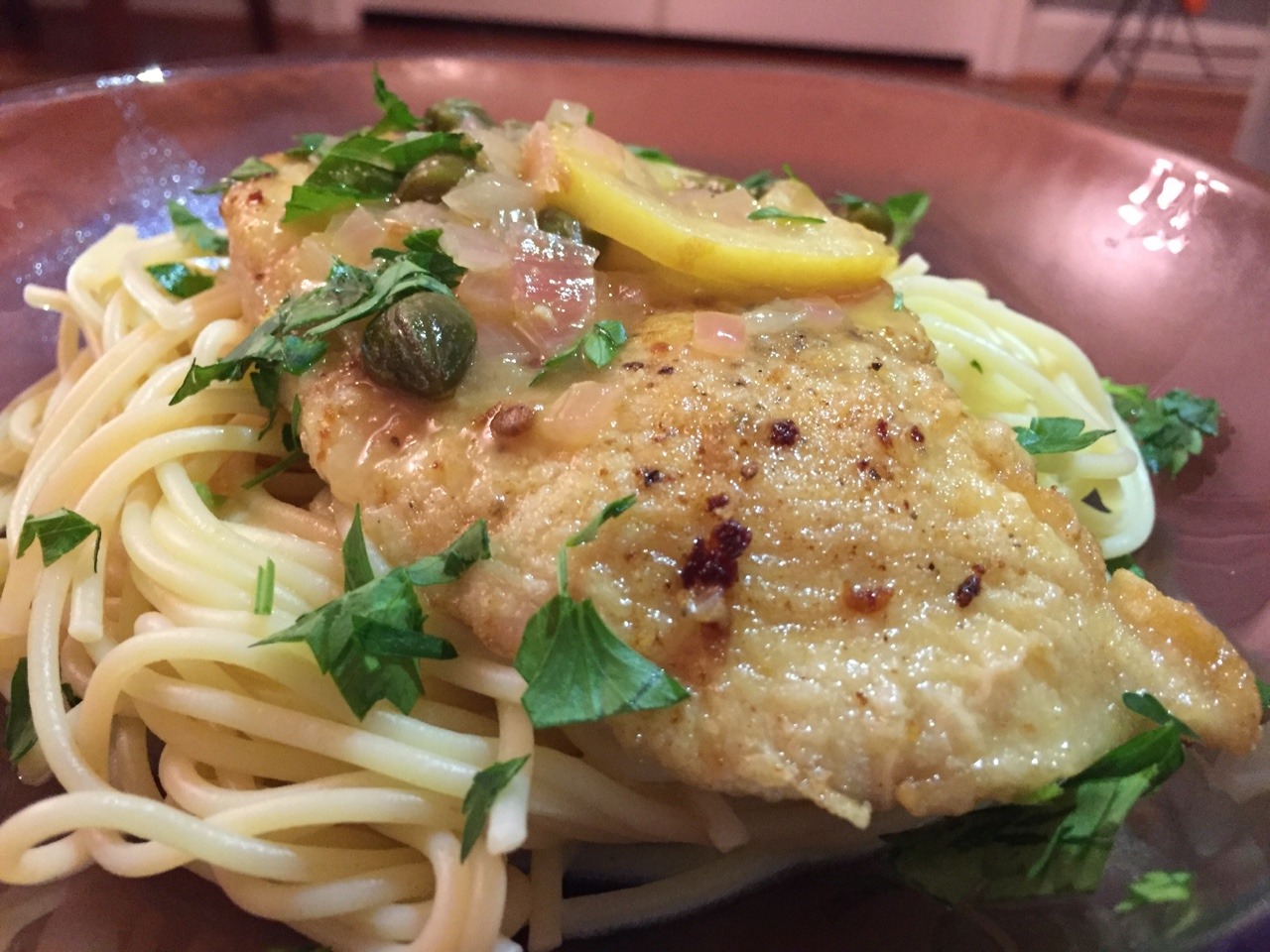 We tried this Food 52 recipe: https://food52.com/recipes/26564-classic-chicken-piccata. We served the dish over thin spaghetti. We finished each serving with a squeeze of fresh lemon quarter (Apr. 2017)