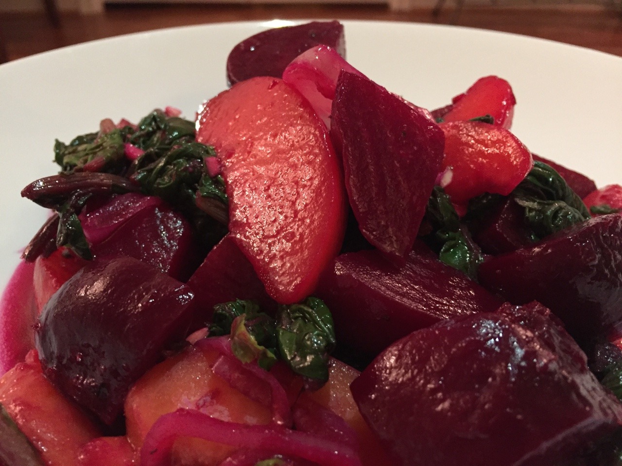 https://www.google.com/amp/s/creativecookinggf.wordpress.com/2014/06/13/roasted-beet-nectarine-salad-cookbook-chat-silk-road-vegetarian/amp/ Our modifications: first, like the original recipe, we omitted pine nuts, nutmeg, and feta cheese. Second, based on seasonal availability, we used 1 lb frozen peach slices in lieu of nectarines; we poured the contents into a bowl at room temperature while preparing the dressing. Third, we used one large shallot in lieu of one small red onion. Rather than chopping it, we sliced the shallot into ¼ inch rings, placed them in a sieve, and poured boiling water overtop to reduce sharpness. Finally, like the original recipe, we used 4 Tbsp olive oil for the dressing. We served this salad with a mezze of hummus, oven-roasted eggplant, and pita bread. (Apr. 2017)