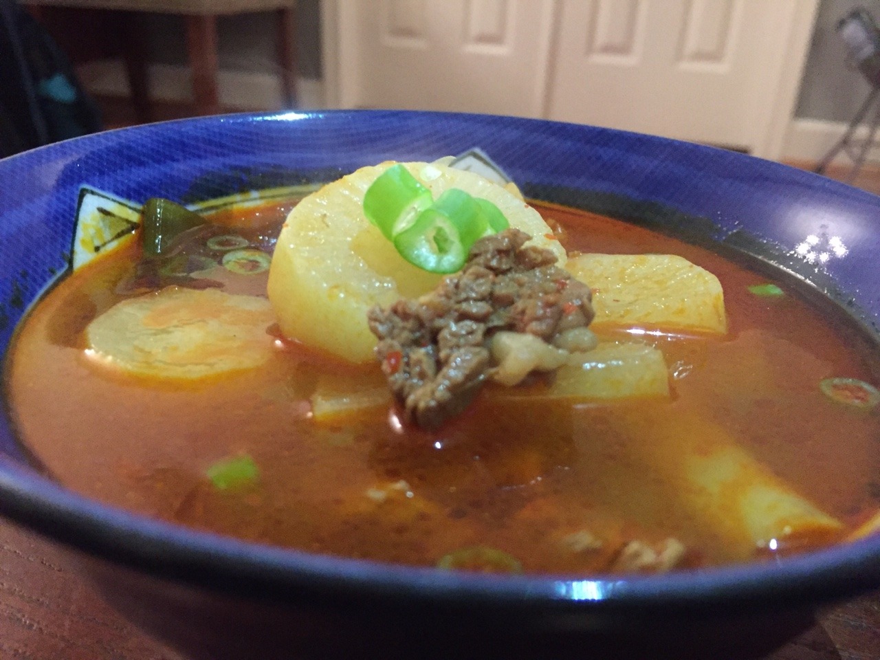 We made this soup loosely based on Maangchi’s recipe: https://www.maangchi.com/recipe/radish-soup However, we made so many modifications (including doubling the original recipe) that I’m rewriting our whole recipe here. First, cut 1 lb skirt steak (preferably trimmed of fat) into bite-sized pieces, then marinate in the following seasonings for about 15-20 mins (see Note below): 1 ½ Tbsp hot pepper flakes (down from 2 Tbsp in the doubled, original recipe), 3 Tbsp fish sauce (down from 4 Tbsp), 2 Tbsp sesame oil, 2 tsp salt, and 4-5 cloves minced garlic. Second, while the meat is marinating, peel one large (about 1 ½ lb, but it can be up to 2 lb) Daikon radish and then cut into ½ inch thick penny slices (if the daikon is fairly narrow in diameter) or into half-moon slices (if the diameter is thick); as most Daikon are cone-shaped, I often cut penny slices along the bottom half and then half-moon slices for the upper half of the radish. Third, heat a large Dutch oven on medium-high heat, and lightly coat the bottom with 1 tsp neutral oil, such as grapeseed or canola. Add the marinated beef and sauté on medium heat until most of the pink color is gone. Fold in the daikon slices, lightly coating them with the red-tinged oil. Pour in 10 cups hot water, bring to a vigorous boil for about 10 mins, and then cover and reduce heat to a medium-low simmer until the daikon is fully cooked (about 30 mins). Add 6 scallions, cut into 2-inch long straws, and then simmer, uncovered, for another 5 mins. Season to taste with salt and black pepper. Separately, chop 1 additional scallion and set aside. When ready to serve, garnish each serving with a sprinkle of chopped scallions. Serve with short-grain rice (we like Haiga, a type of brown rice that retains the rice germ but not the rice bran). We often also serve with egg white omelette on the side for contrasting texture and as a mild foil for the spicy soup. (May 2017)