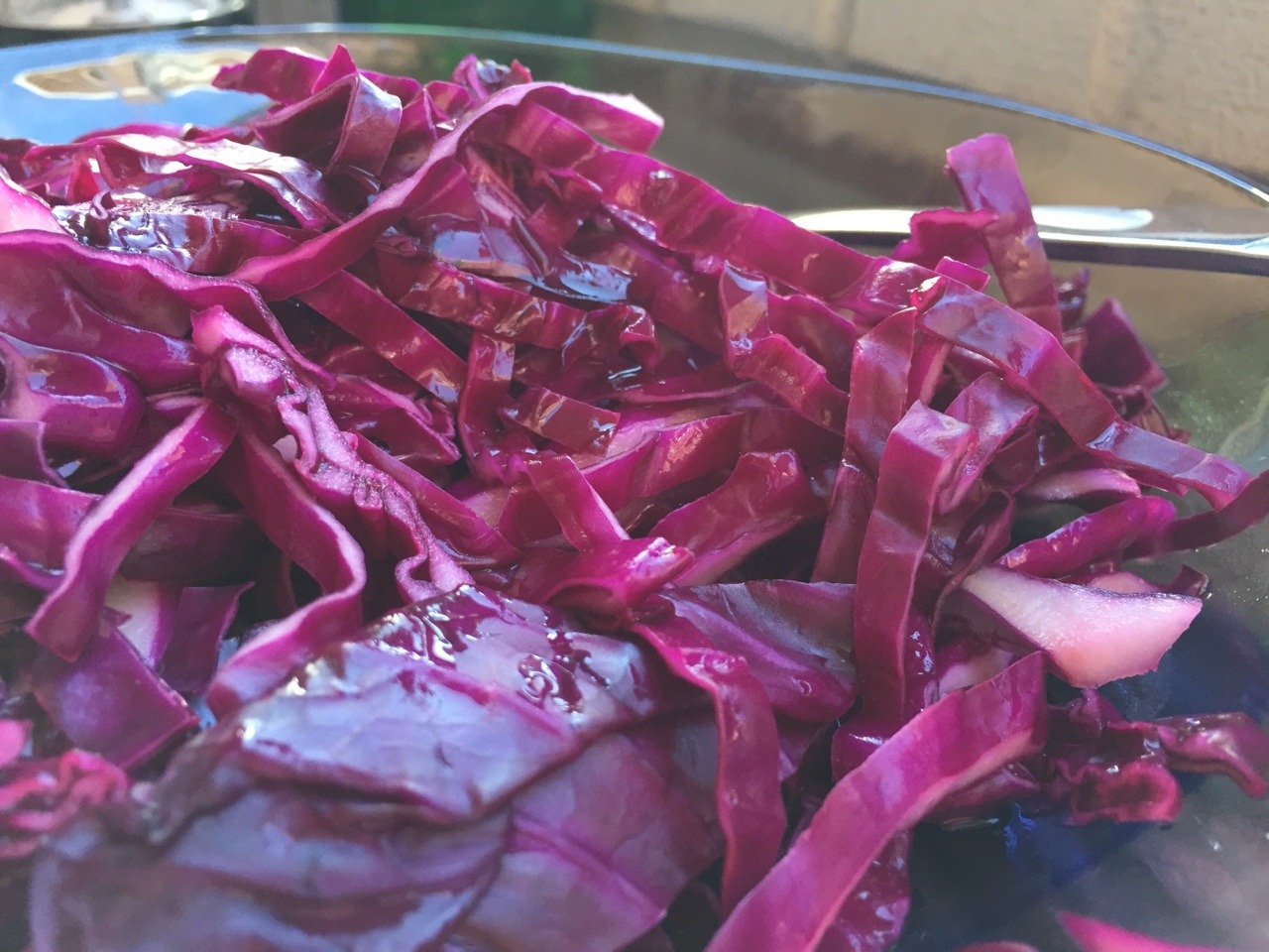 I learned this recipe from my Burmese-American friend, Waimar. Cut a small, tight head of red or white cabbage in half vertically, then cut one half into two quarters (you can set aside the remaining half head for later use). Remove the core from each wedge, then cut into thin (¼ inch) slices lengthwise along the grain. This should yield 3-4 cups. Place in a colander and rinse, then liberally salt (about 1 Tbsp) throughout the sliced cabbage and let sit for about 10 mins. Rinse thoroughly, then place in a medium mixing bowl. Lightly season with salt (about ¼ tsp), then toss with fresh lime juice to taste (I typically use ½ to 2/3 of a lime). Serve immediately. This is a nice side dish for soy-based dishes such as chicken adobo or teriyaki chicken. (May 2017)