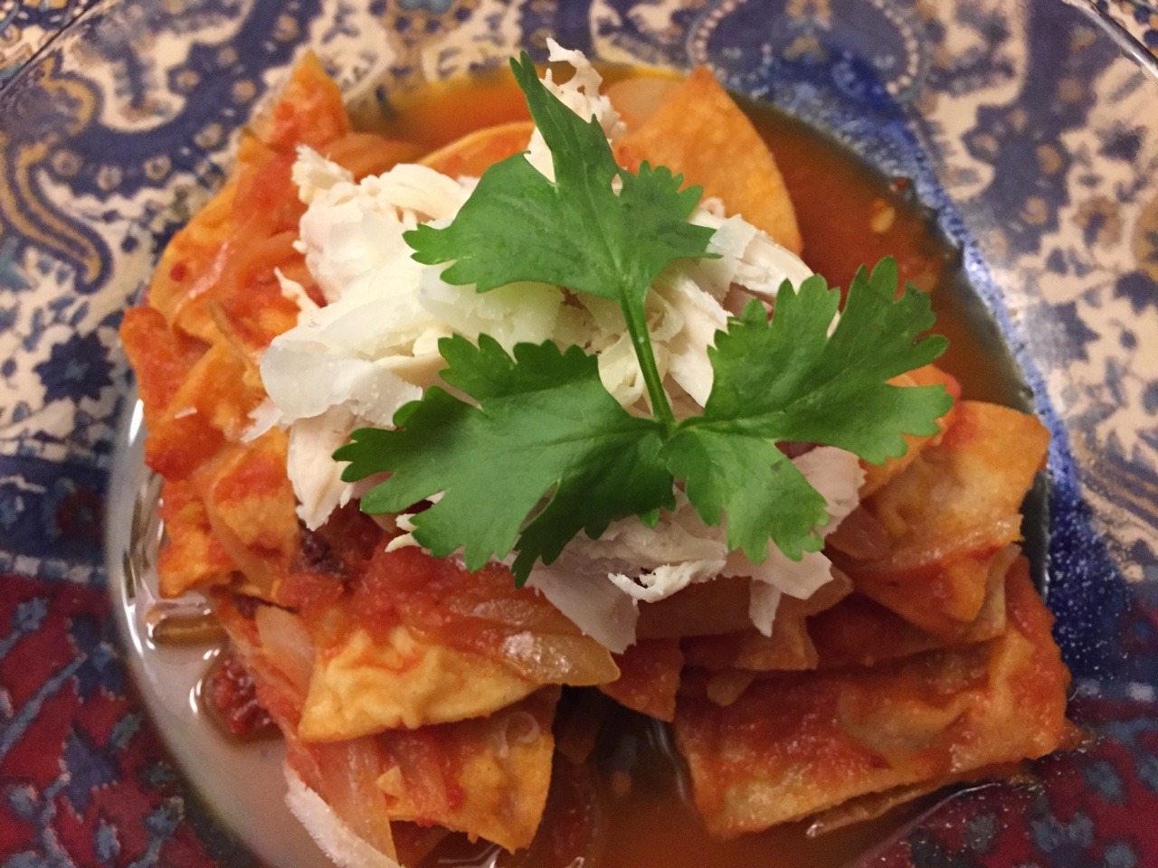 Note: The tortilla chips quickly soak up the sauce and become soggy, so we submerged only half of the chips into the sauce. (We set aside the remaining chips – still crispy and dry – and the remaining sauce separately for a later meal.) We plated the sauced chips, topped with shredded poached chicken (about ¼ cup per serving), garnished with shredded manchego cheese (substitute for oaxacan or chihuahua cheese) and some cilantro, and served immediately.