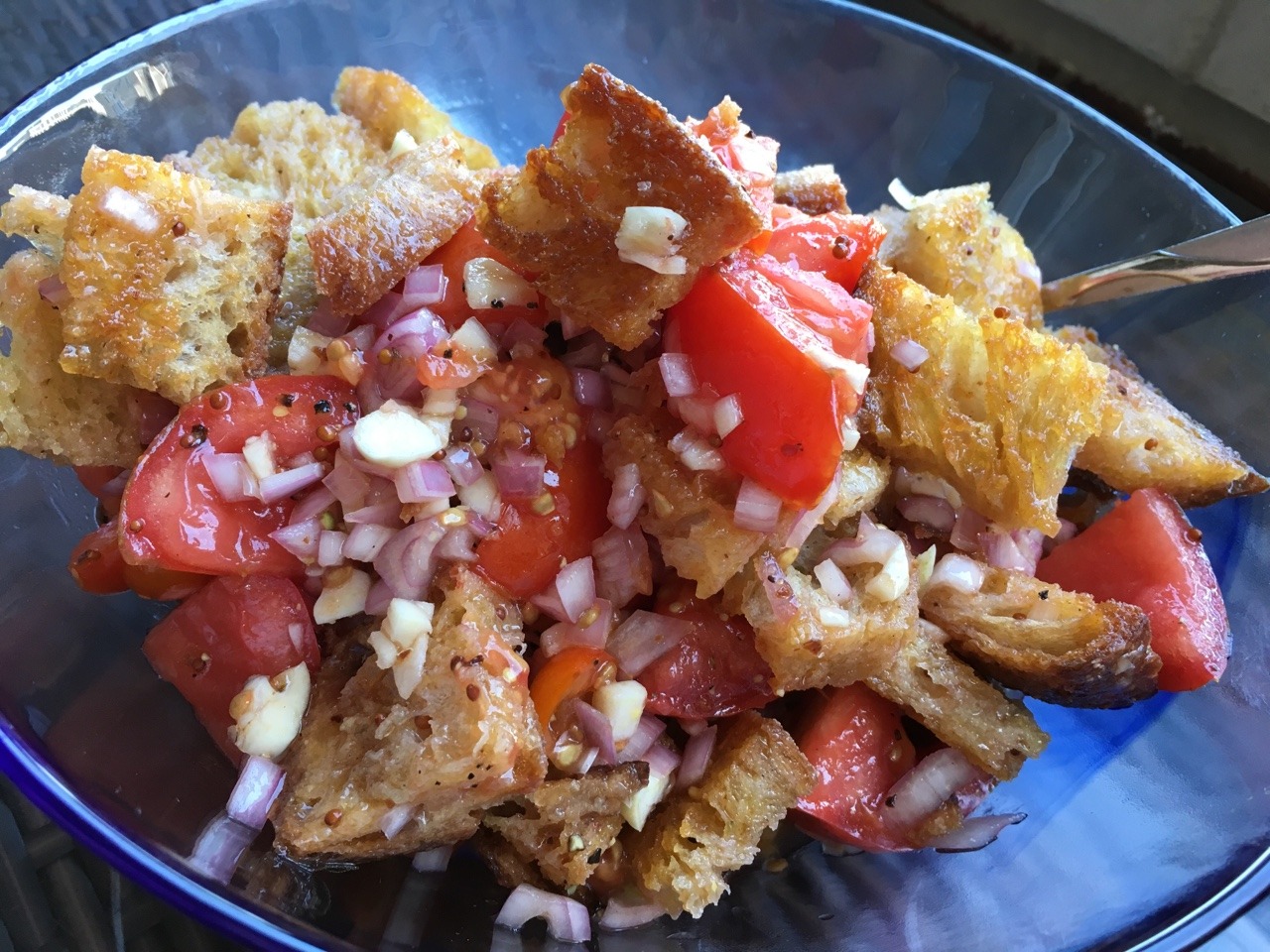 Our modifications: we used 2/3 lb sliced Whole Foods pain de campagne (country bread), which we cut into bite-sized pieces. After lightly coating them with olive oil, we sprinkled about 1 tsp dried Greek oregano before toasting in the oven (at 400 for 7-10 mins, turning over once). Second, we used 3 vine-ripened medium tomatoes (see Note below) and 3 tiny cherry tomatoes (the latter from our balcony garden). Fourth, we used a mix of white and red wine vinegar (1 Tbsp each), reduced the olive oil to 2-3 Tbsp, and omitted the fresh basil. Finally, while tasting the dressing, we found it a little sour, so we added 1 tsp sugar and about 2 tsp fruit-infused white balsamic vinegar. (Sept. 2017)