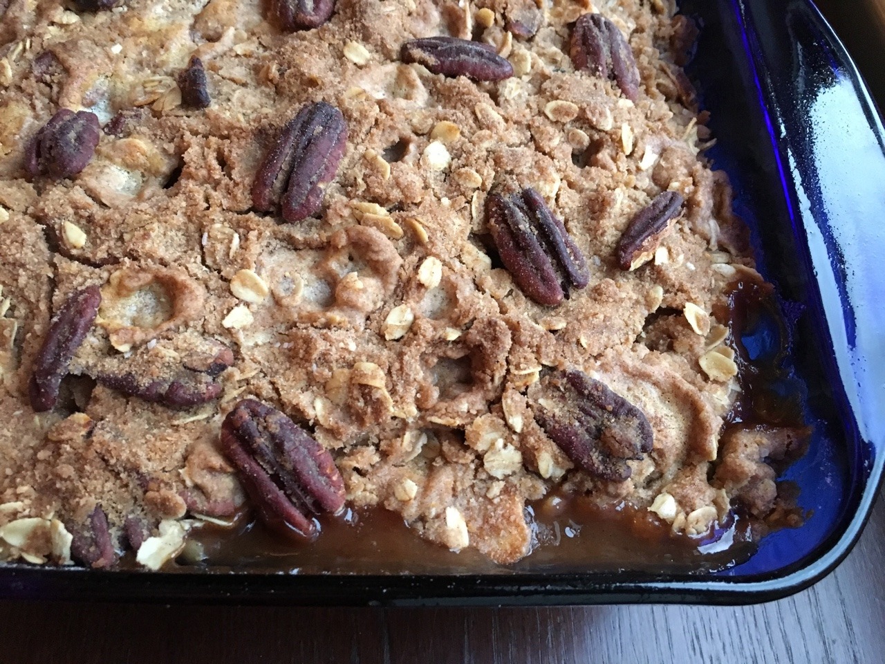 After our trip to the orchard, we tried this recipe: http://www.kingarthurflour.com/recipes/classic-apple-crisp-recipe Our modifications: first, we used about 8 apples (combo of small and medium, multiple varieties), peeled, cored, quarter, and cut into ¼” slices. Second, in lieu of 2 Tbsp boiled apple cider, we used 2 Tbsp pomegranate molasses. Third, instead of apple pie spice, we used: 1 tsp cinnamon, ¼ tsp nutmeg, 1/8 + 1/16 tsp allspice, and 1/16 tsp cardamom powder. Fourth, for the topping, we used old fashioned oats instead of quick-cook oats. Finally, instead of ½ cup pecan pieces, we used ½ cup pecan halves. (Oct. 2017)