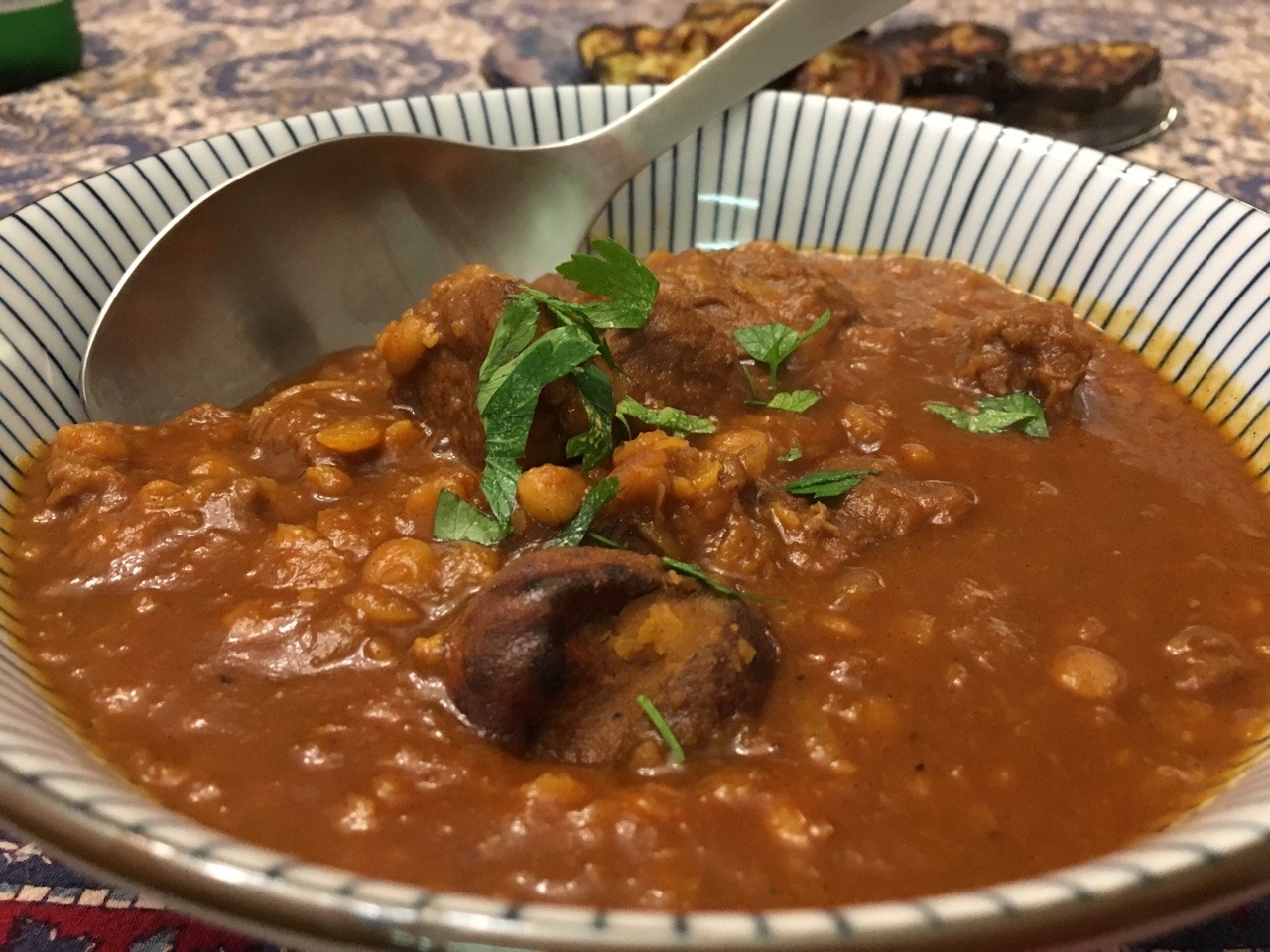 Note: We served the stew with basmati rice and oven-roasted eggplant (2 medium eggplant cut into ½ inch thick rounds) and roasted at 400 degrees for 40 mins, recipe here: http://piglettedc.tumblr.com/post/143686120171/oven-roasted-eggplant-preheat-oven-to-450-cut We started roasting the eggplant during the last 40 mins of the stew’s simmer time.