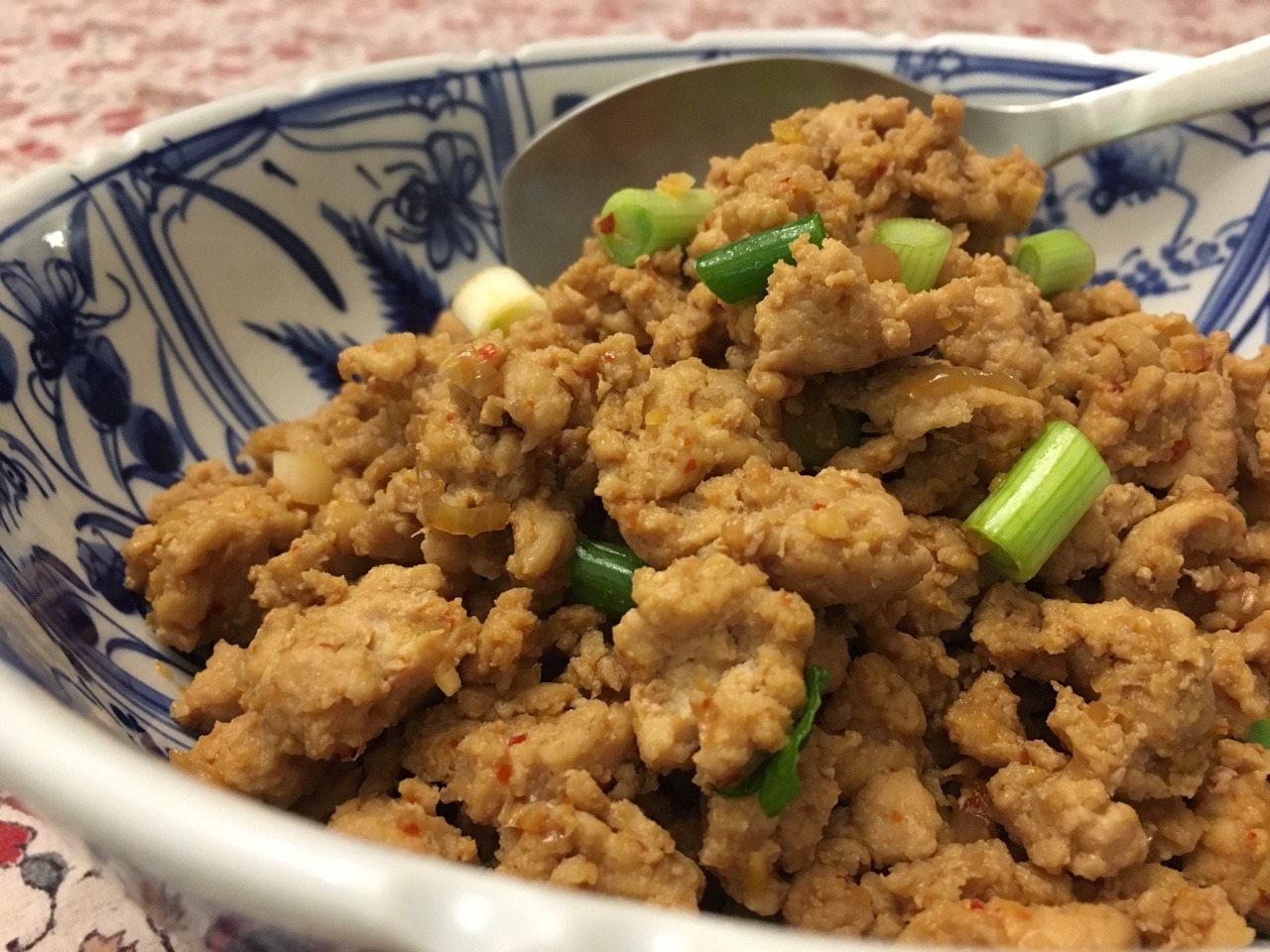 We followed this recipe: https://www.kawalingpinoy.com/korean-ground-beef/ Our modifications: first, for health reasons, we used minced chicken instead of minced beef; because the chicken emitted a lot of liquid, we removed all possible liquid (about ¼ cup) before adding the marinade. Second, to reduce sodium, we doubled the amount of protein, garlic, and ginger (to 2 lb) without changing the marinade amount. We found the dish well-seasoned and flavorful, without being too salty. Third, we added a shallot (cut into ¼ inch crosswise slices) and sautéed it in a little oil before adding the minced garlic and ginger. We served this with rice and romaine lettuce leaves. (Jan. 2018)