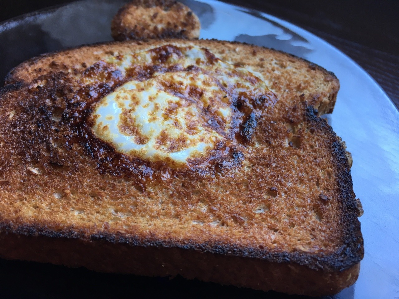 We followed this basic recipe: http://allrecipes.com/recipe/187850/egg-in-a-hole/ To make it healthier, we sprayed oil in a nonstick pan instead of using bacon grease. (Jan. 2018)