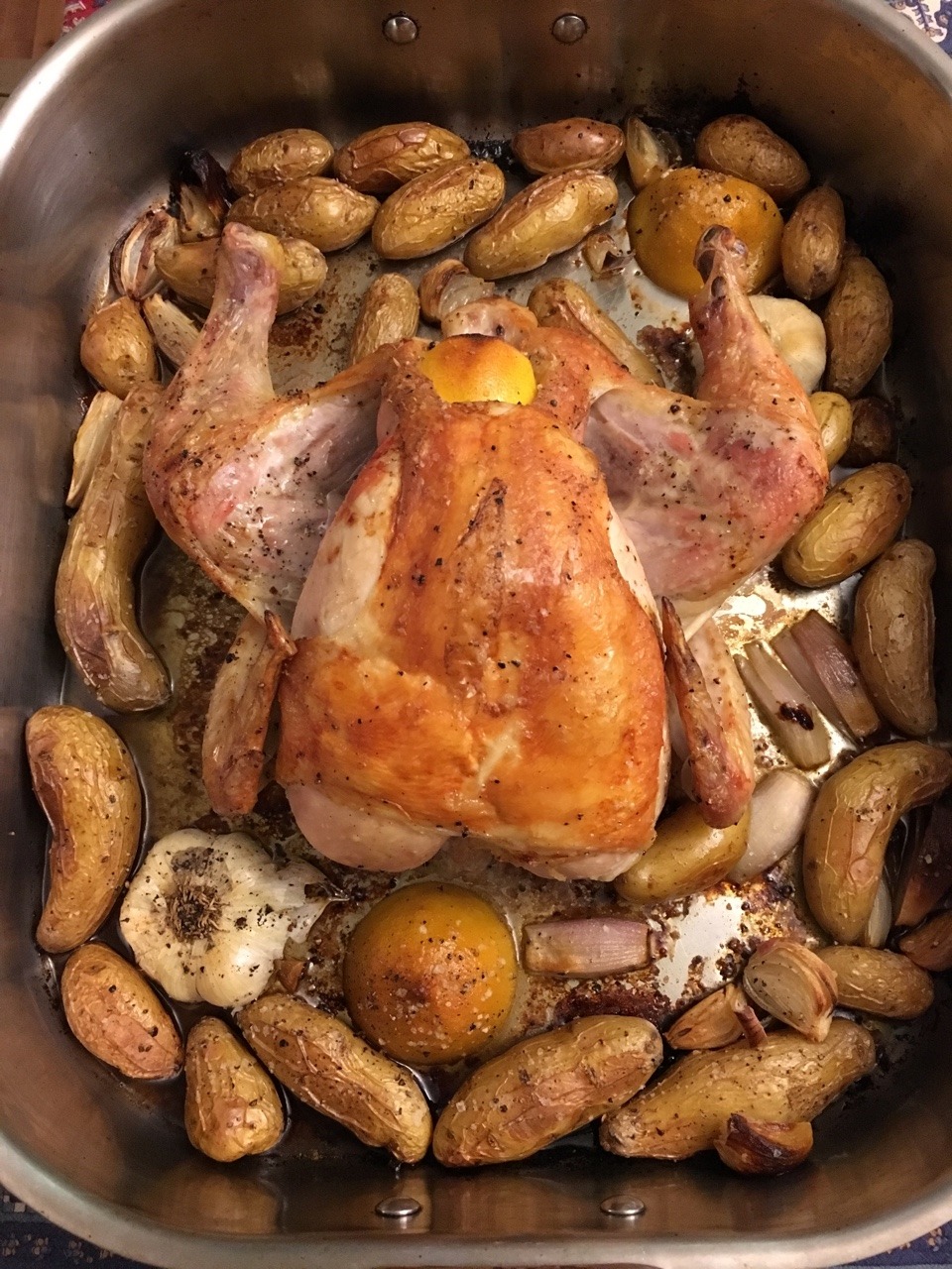 We tried this recipe: https://www.bonappetit.com/recipe/no-fail-roast-chicken-with-lemon-and-garlic We used ¼ cup melted butter, as directed. Our modifications: first, we added 1 lb fingerling potatoes and 5 shallots (peeled and rough-cut) to the roasting pan along with the half-lemon and garlic bulbs cut crosswise. We drizzled the vegetables with olive oil and lightly seasoned with salt and black pepper. Second, we used paper towels to pat dry the chicken – the outside, the cavity, and the cut, exposed parts of the quarters – in order to maximize crispy skin. Third, we cut a second lemon in half and placed both halves in the cavity. Finally, because we used a larger chicken (5 lb), we increased the cooking time to 70 mins (1 hour 10 mins) and then let it sit for 10 mins before carving. (Jan. 2018)
