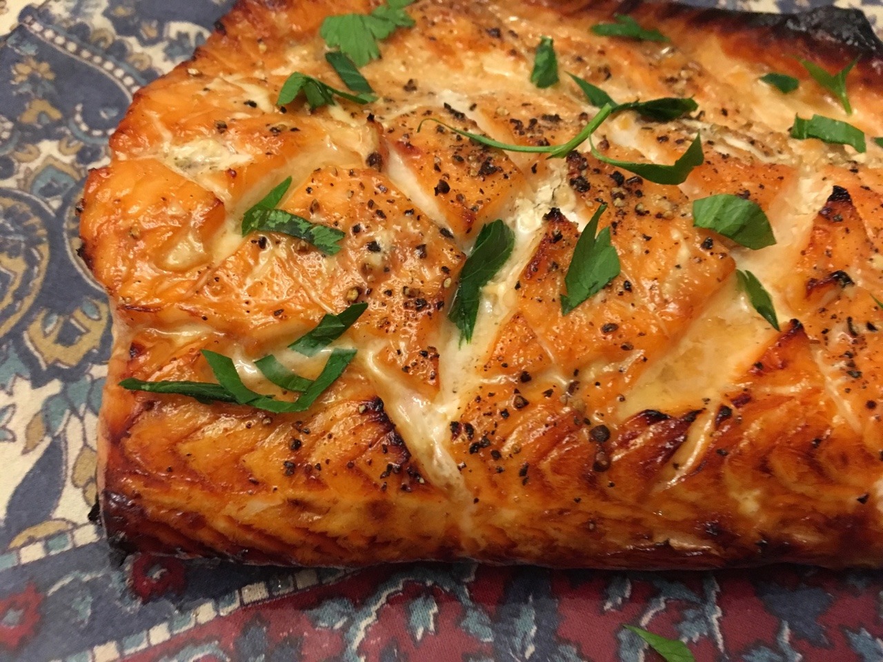 We drizzled about 1 Tbsp soy sauce, 2 Tbsp mirin, and 2 tsp honey, and 1 tsp freshly ground black pepper over 1 ½ lb salmon fillet (see Note below). We let the salmon sit for about 10 mins while we prepped the side dishes (such as portobello and asparagus). We lined a baking sheet with foil, then placed a baking rack on top. We sprayed the rack with oil, then placed the salmon – skin side down – on the oiled rack (see Note 2 below). We baked until the fish was flaky (about 20-25 mins). We then lightly sprayed the top of the salmon with some oil and broiled (on low) about 4 inches from the flame until the surface was nicely caramelized. We carefully plated the salmon, garnishing it with some chopped parsley. (Jan. 2018)