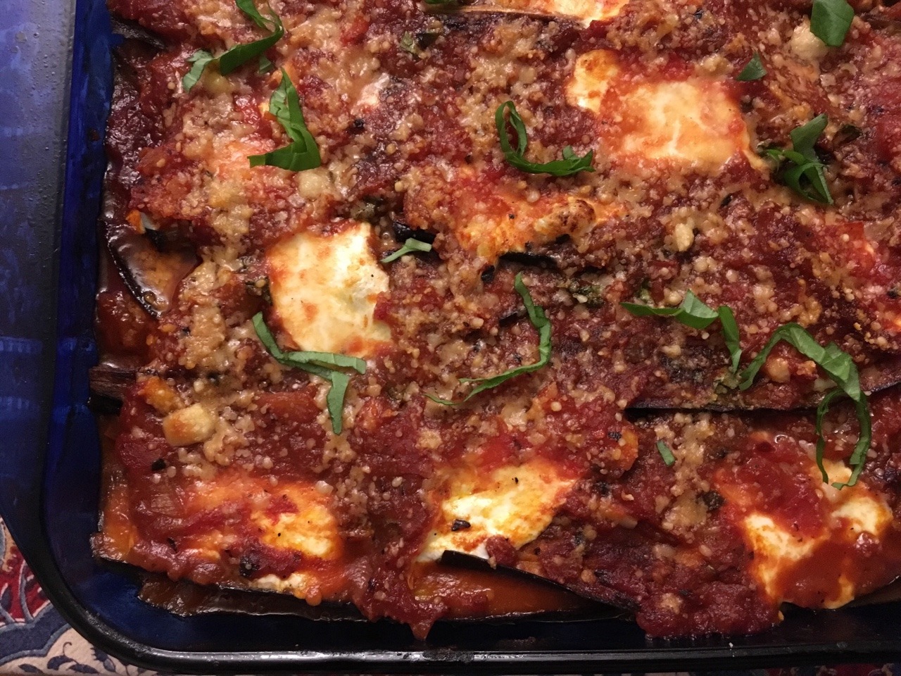 We tried this Cookie & Kate recipe, which uses oven-roasted, non-breaded eggplant slices: https://cookieandkate.com/2017/italian-eggplant-parmesan-recipe/ Our modifications: first, we doubled the amount of sauce because we prefer saucy casseroles. Even so, we almost ran out of sauce for the final layer (we had three layers of eggplant). Second, we did not have a 9×9” baking dish, so we used a deep 8×8” baking dish, which we lightly sprayed with oil before assembling the casserole. We served this over cooked pasta. (Feb. 2018)