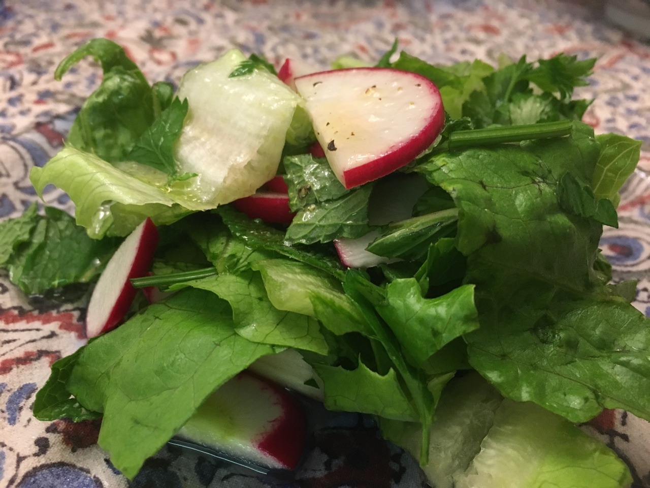 We roughly followed a recipe in Faye Levy’s cookbook, Feast from the Mideast. First, we tossed together: 4 romaine lettuce leaves (cut into bite-sized cut into 2 inch pieces), 6 red radishes (cut into ¼ inch half moons), and 2 Tbsp each chopped Italian parsley and spearmint. Second, we whisked together the juice of 1 ½ lemons and 2 Tbsp olive oil with a little salt and pepper. For each serving, we drizzled the dressing over each individual salad plate. (Feb. 2018)