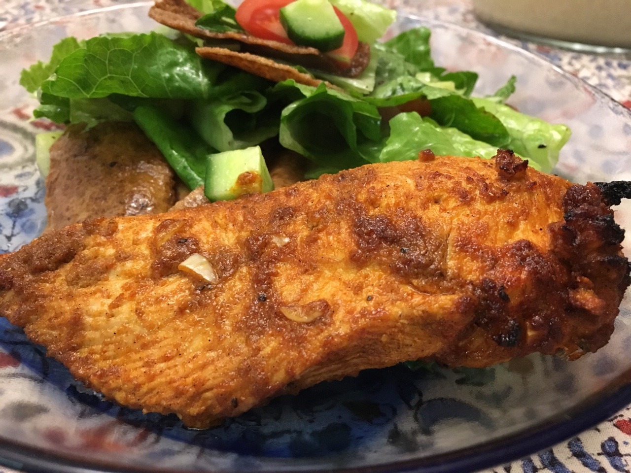 We followed this marinade: https://www.recipetineats.com/chicken-sharwama-middle-eastern/ Our modifications: first, we used 2 lb (3 pieces) boneless skinless chicken breast cut into half lengthwise (yielding 6 cutlets). Second, we reduced the amount of cardamom from 1 Tbsp to 1 tsp to avoid any cloying flavor. We also reduced the cayenne from 1 tsp to ½ to ¾ tsp. We increased the lemon juice to 1 full lemon. Third, we marinated the chicken cutlets for 1 hour before roasting it on a lightly oil-sprayed baking rack (placed inside a foil-lined baking sheet) at 400 until a knife came out clean (about 15 mins total); we turned the sides once midway. We then finished it under the broiler on high until browned on each side (about 3-5 mins). We served this chicken with this Lebanese fattoush salad: http://piglettedc.tumblr.com/post/171465853771/lebanese-fattoush-salad-we-followed-this-recipe (Mar. 2018)