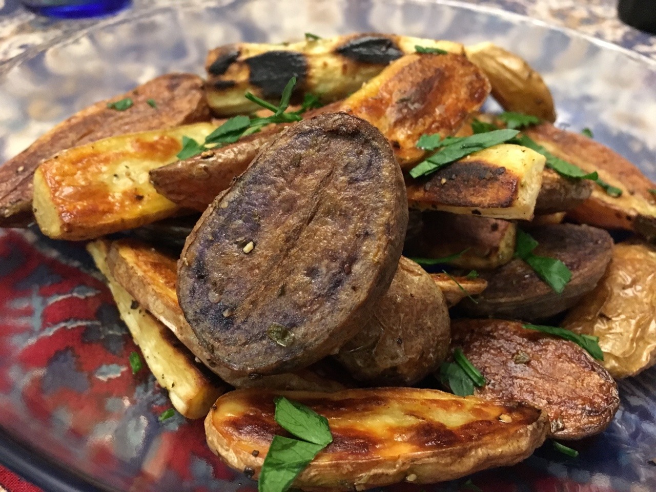 We tried this recipe: https://www.epicurious.com/recipes/food/views/roasted-baby-potatoes-with-thyme-and-rosemary-237107 We cut skin-on baby fingerings in vertical halves and peeled and cut two parsnips to make them similar in size and shape to the halved fingerlings. We toss them in olive oil, a little salt and pepper, and a few sprinkles (about ½ tsp) dried Greek oregano. We placed the pieces in a single layer, cut side down, on a baking sheet and roasted in a preheated 450 degree oven for 30 mins, turning halfway. (Mar. 2018)