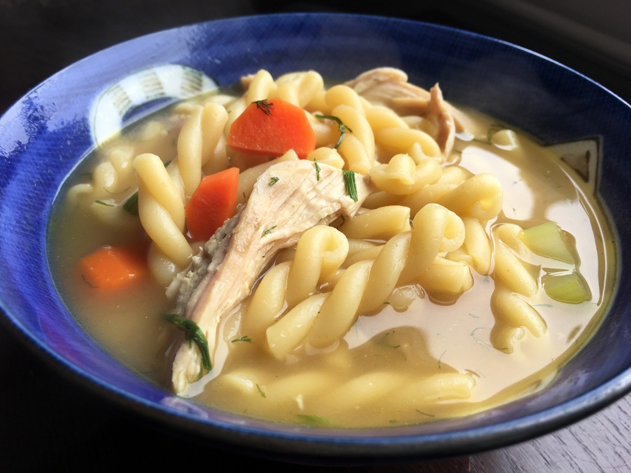 This was a great pantry soup based on leftover Peruvian rotisserie chicken. We generally followed this recipe: https://toriavey.com/toris-kitchen/rotisserie-chicken-rice-soup/ Our modifications: first, because we had only half a rotisserie chicken, we used a combination of 8 cups unsalted chicken broth, 4 cups seasoned chicken broth, and 2 cups water instead of 16 cups water. Second, we used a halved, skin-on large shallot instead of a small onion. Third, due to time constraints, we reduced the simmering time from 90 mins to 60 mins. Fourth, we used a large hand strainer to remove the flavoring ingredients (peppercorns, cloves, bay leaves, chicken bones and skin, first round of celery and carrots, and parsley and onion), which enabled us the same pot for the final round of cooking. Finally, instead of rice, we added 1 lb uncooked gemelli pasta (we may reduce to ½ lb next time). We added the pasta at the same time as the cooked, shredded chicken and the uncooked celery and carrots. We added 2 Tbsp chopped, frozen dill at the very end of cooking and seasoned with a dash each ground black pepper and onion powder. (Mar. 2018)