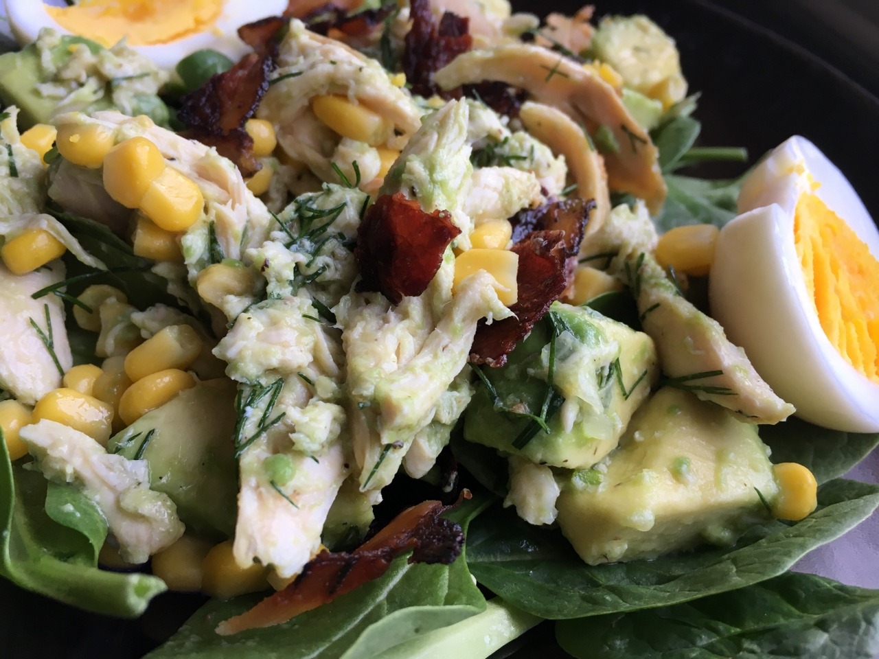 Thanks to my friend Cheryl, we decided to try this recipe: https://natashaskitchen.com/2017/07/28/avocado-chicken-salad-recipe/ Our modifications: first, instead of two cooked chicken breasts, we used half of a rotisserie chicken, shredded and mainly without skin. Second, for the bacon, we used half of a 2.1 oz package of precooked bacon (about 6 strips), which we microwaved for 60 seconds before crumbling (see Note below)Third, we used 1 cup canned corn (which we rinsed and drain) instead of freshly cooked corn kernels. Fourth, we served the salad over a bed of baby spinach. Finally, we garnished the salad with medium-boiled eggs, recipe here: https://www.thekitchn.com/how-to-boil-eggs-perfectly-every-time-video-202415 (Apr. 2018)