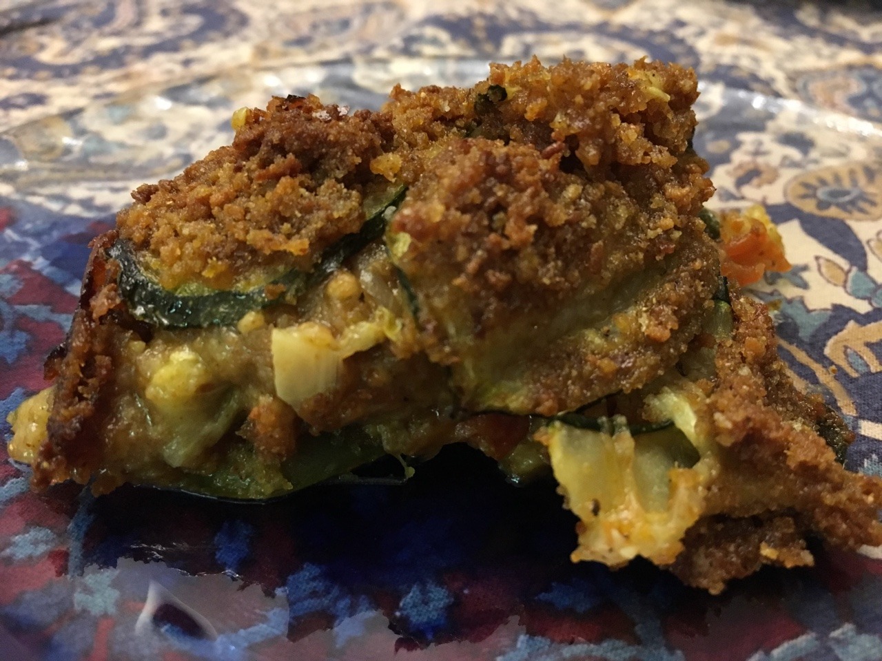 We tried this NYT recipe: https://cooking.nytimes.com/recipes/1014910-zucchini-tian-with-curried-bread-crumbs Our modifications: first, we used plain bread crumbs instead of panko flakes. Second, we found that 2 large zucchini was more than enough for this recipe. Third, we used 3 medium vine-ripened tomatoes (rough cut) instead of 1 pint grape tomatoes. Finally, we used lemon zest instead of orange zest. (May 2018)