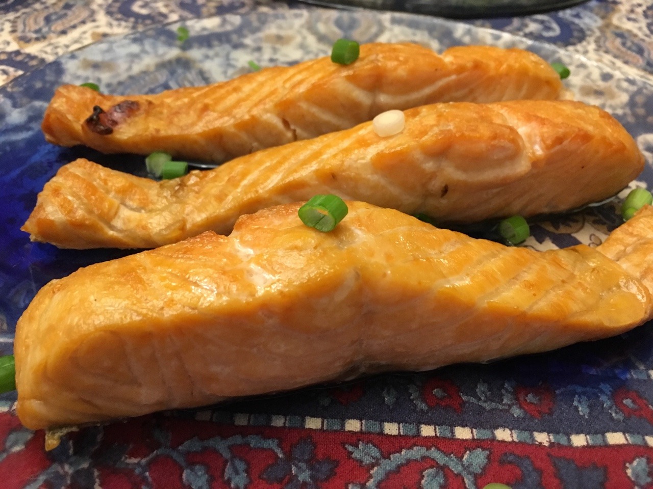 We tried this recipe: https://www.japanesecooking101.com/shiozake-recipe/ We dry-salted the salmon (about ¾ tsp per 1-inch thick filet) overnight. (For a 1.5 lb salmon filet, we cut about 4 ½ pieces.) Because we did not a grill, we used the oven. We first lined a baking sheet with foil, then placed a wire rack on top of the foil. Then we sprayed the rack with oil before placing the salmon, skin side down, on the oiled rack. We oven-roasted at 450 for 15 mins and then oven-broiled (on high, with the rack 8 inches below to minimize splattering) until the salmon was fully cooked and lightly browned (about 5 mins).