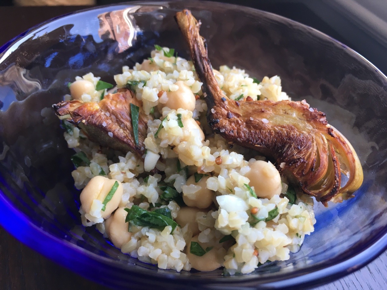 We tried this NYT recipe: https://cooking.nytimes.com/recipes/1016221-bulgur-and-chickpea-salad-with-roasted-artichokes First, for detailed instructions on trimming and roasting artichokes, see this method post: http://piglettedc.tumblr.com/post/175450614661/oven-roasted-trimmed-artichokes-we-trimmed-large Second, we modified this NYT recipe by reducing the amount of salt to barely ½ tsp total and using no-salt canned chick peas. We also used 1 Tbsp dried chives instead of 2 Tbsp fresh chives and increased the Dijon to 1 ½ tsp (from 1 tsp). Finally, we seasoned to taste with a dash of sugar (maybe 1 tsp) and a splash of fruit-infused white balsamic vinegar (maybe 1 tsp). (July 2018)
