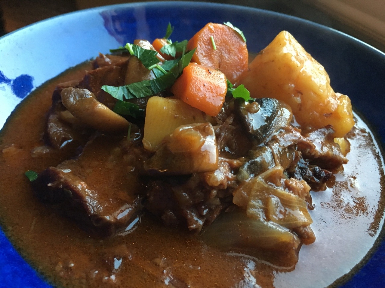 It was supposed to take less than an hour, but with prep and multiple steps involved, it took over 2 hours and was quite complicated. Our modifications: first, given the diameter of a standard pressure cooker, we recommend cutting the chuck roast steaks into 6 pieces rather than 3 to ensure that they can brown on the bottom of the pot. For the same reason, for we recommend cutting the flavoring vegetables – 2 carrots and 2 celery stalks – in half rather than leaving them whole. Second, you may need 2 ½ Tbsp (not 2 Tbsp) flour to lightly coat the beef chunks. Finally, to reduce sodium, we halved the amounts of soy sauce, fish sauce, and Worcestershire sauce to ½ Tbsp each, and we used unsalted chicken broth. (July 2018)
