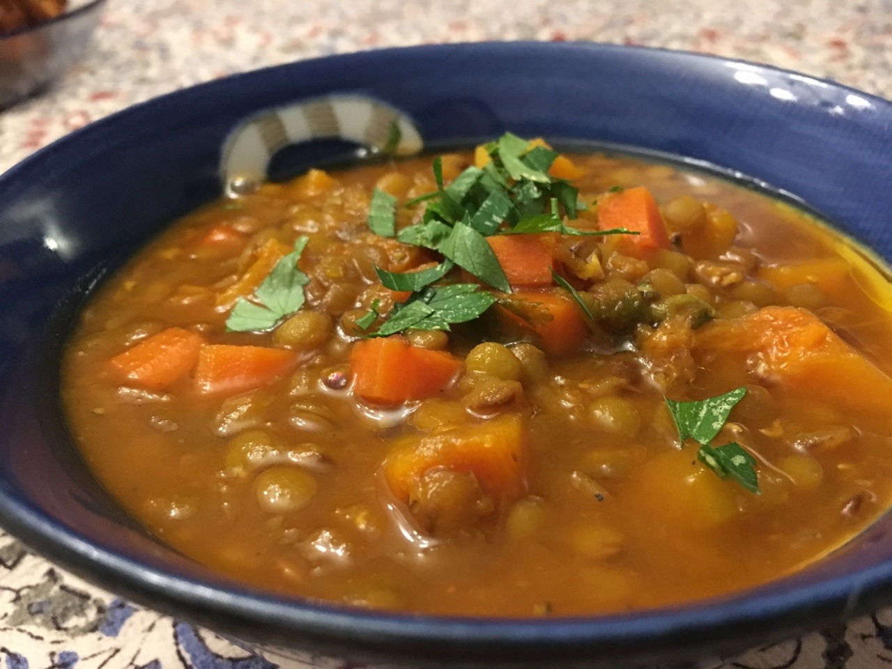 We tried this NYT recipe: https://cooking.nytimes.com/recipes/1013357-lentil-stew-with-pumpkin-or-sweet-potatoes We used 1 lb butternut squash (the smallest we could find) (see Note below) and 1 carrot instead of ½ lb squash and 2 carrots. We finished the soup (after turning off heat) with juice from half a lemon. We also found this recipe took about 2 hours to make, including prep time. This recipe easily can be vegetarian if you use vegetable stock or water in lieu of chicken broth. (July 2018)
